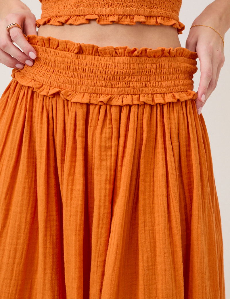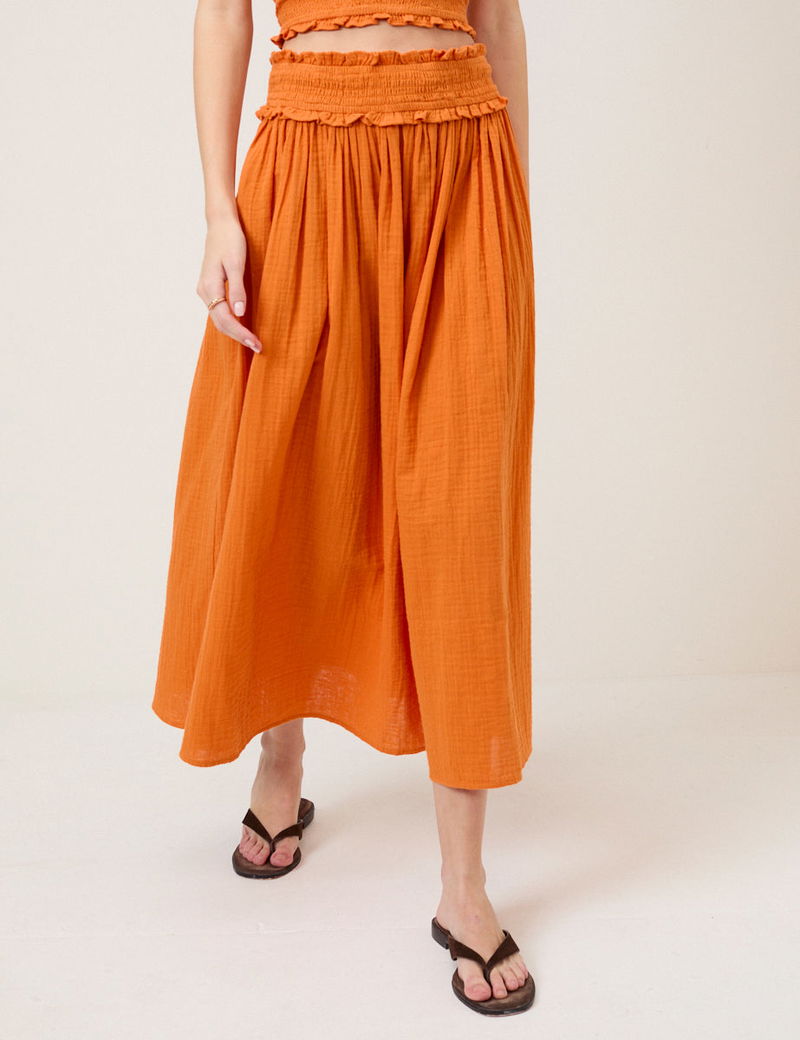 Crafted from soft pure cotton, this orange midi skirt features a high ruffled waist, shirred for comfort. It falls to a relaxed silhouette that moves with ease. Style with the matching top.
