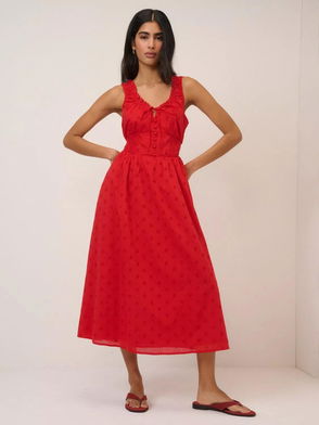 In soft dobby-textured cotton, this red one-shoulder midi dress features a shirred bodice with a subtle drop waist for added shaping. It falls to a relaxed, tiered skirt with gentle movement.