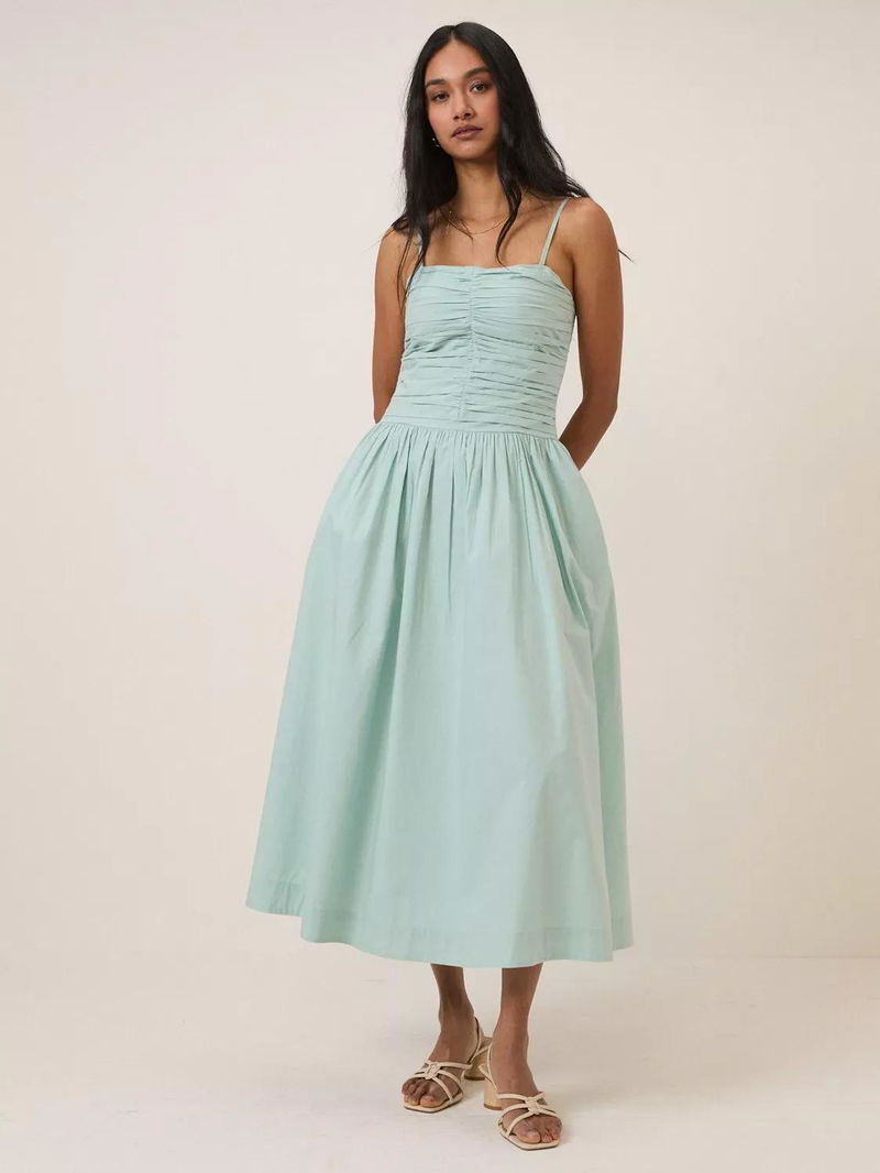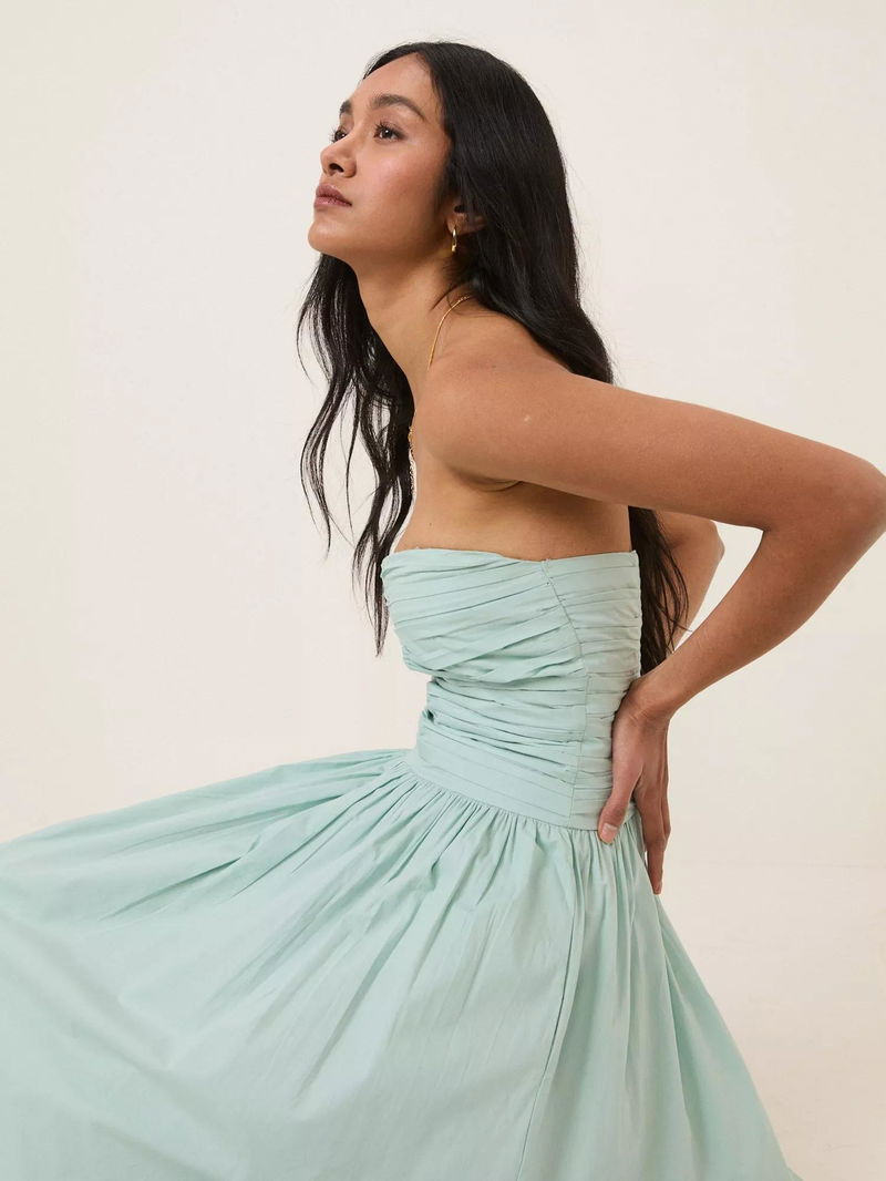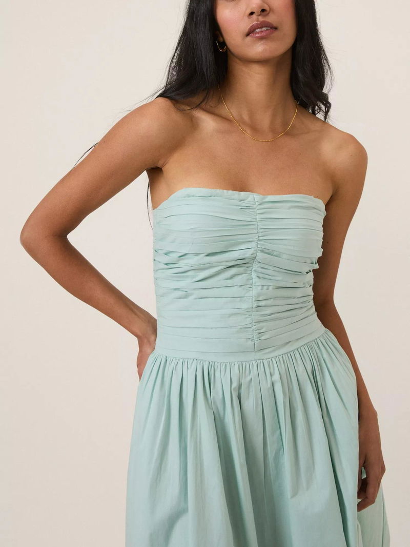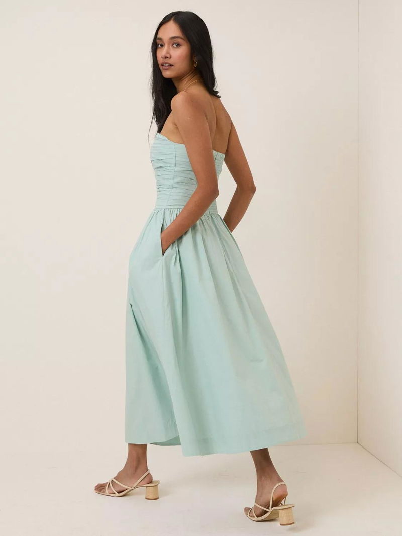 This bandeau midi dress features a fitted bodice with centre seam detailing, tucked and gathered for light texture. Shaped by the shirred back, it falls to a relaxed skirt.