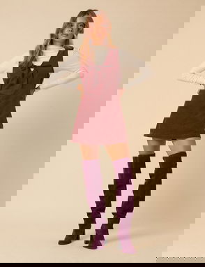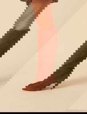 Designed in warm tan, these thigh-high suede boots feature a round toe and stacked heel. They’re finished in a softly slouched silhouette for easy wear.