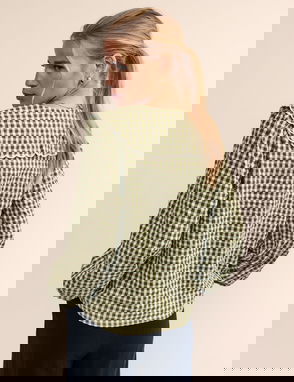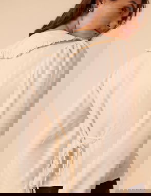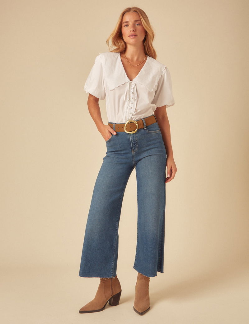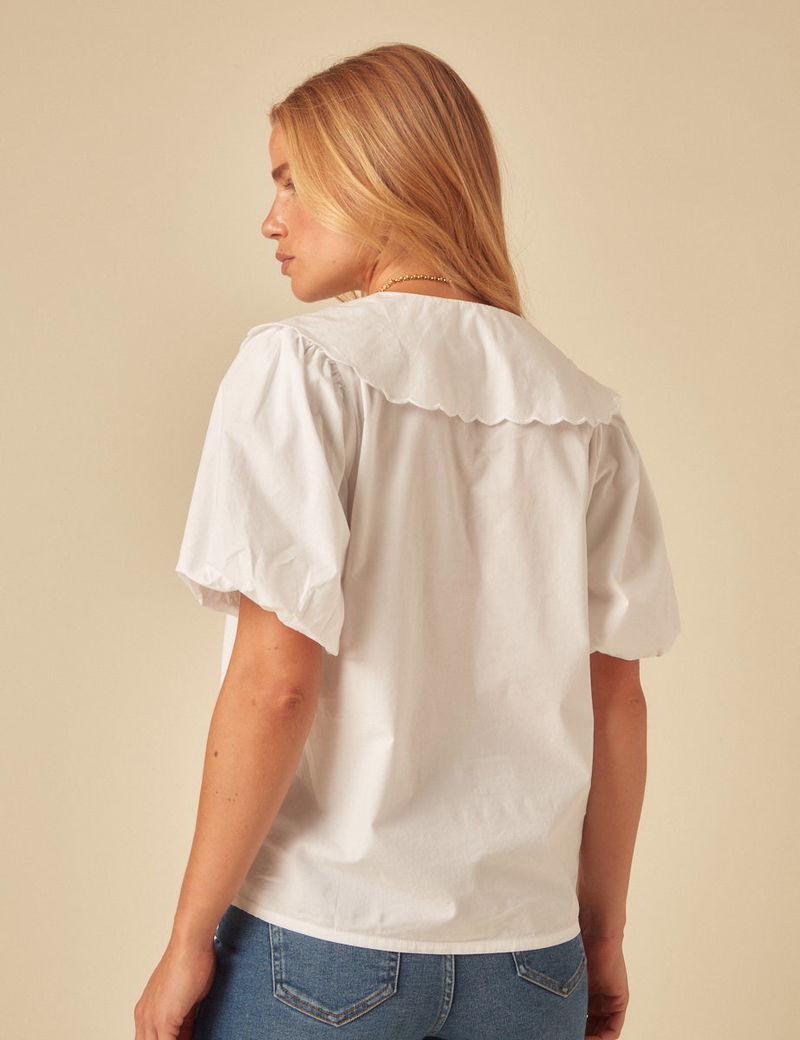 The much-loved Birdie blouse is back with short puff sleeves. Don’t miss the delicate scallop trim, string tie detailing and fabric covered buttons.