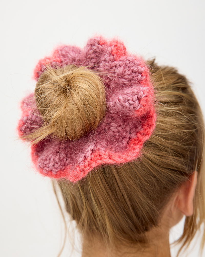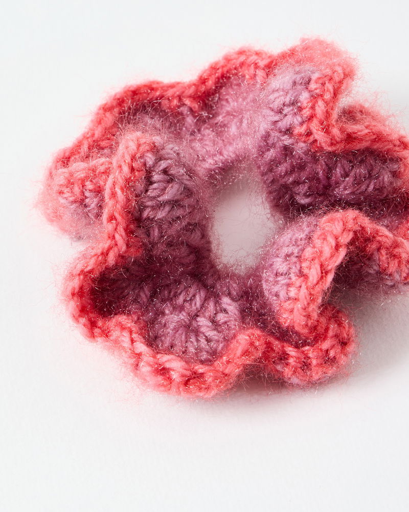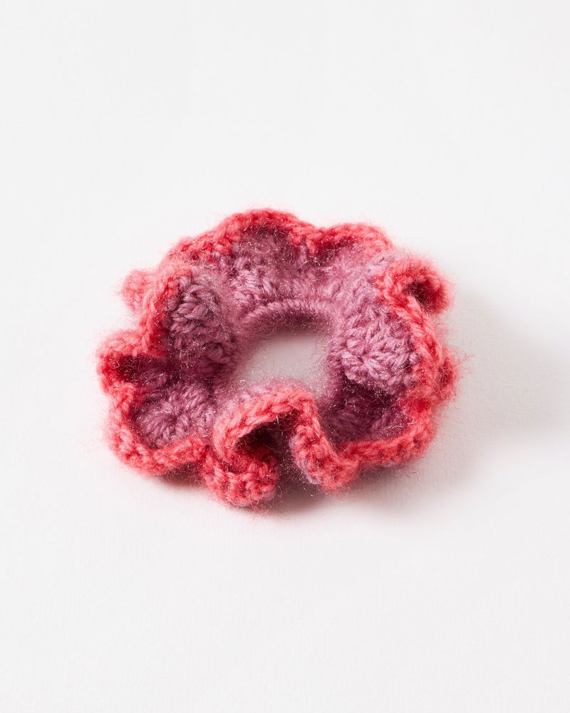 Add interest to your bun or ponytail with our purple crochet scrunchie accented with a coral-pink trim (because you can never have enough colour).
