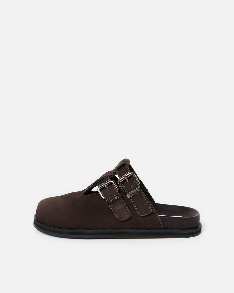 Dark brown leather clogs in an easy slip-on design, crafted with a double buckle strap with an adjustable metal pin buckle. Complete with a soft footbed and rubber sole that offers extra comfort, it's a versatile wardrobe staple that can be worn all year round.