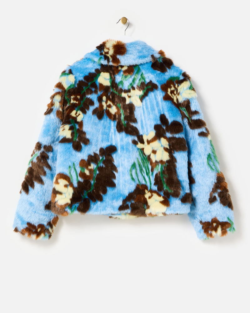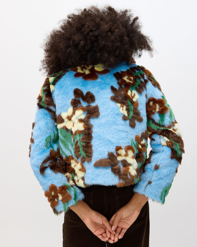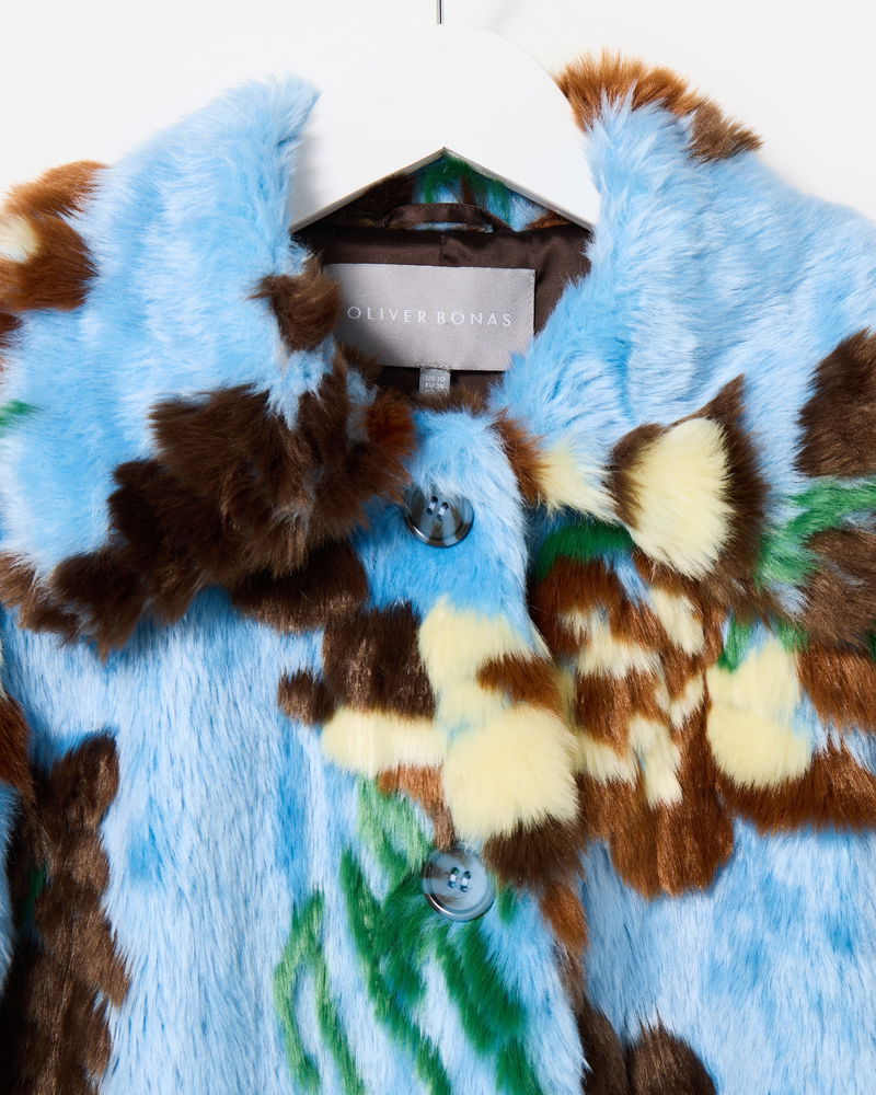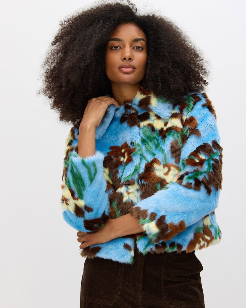 Cosy can still be a statement. This blue faux fur coat is alive with brown flowers and green vines woven through the fabric. With neat button fastenings, it is warm, plush and guaranteed to start a conversation.