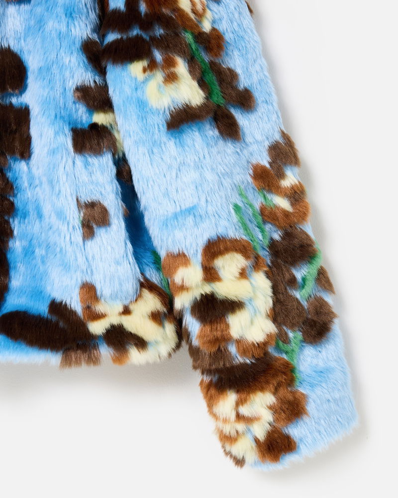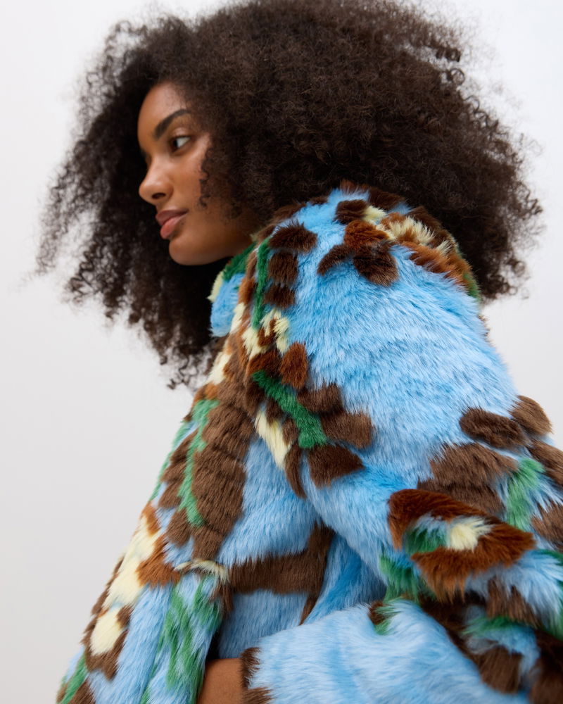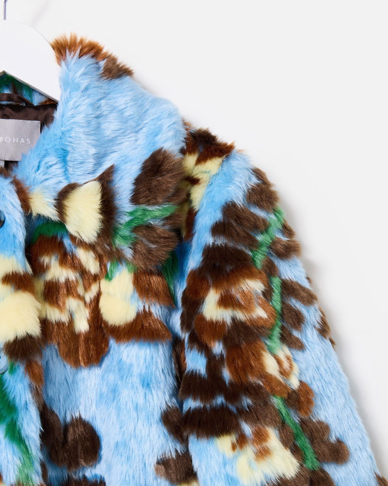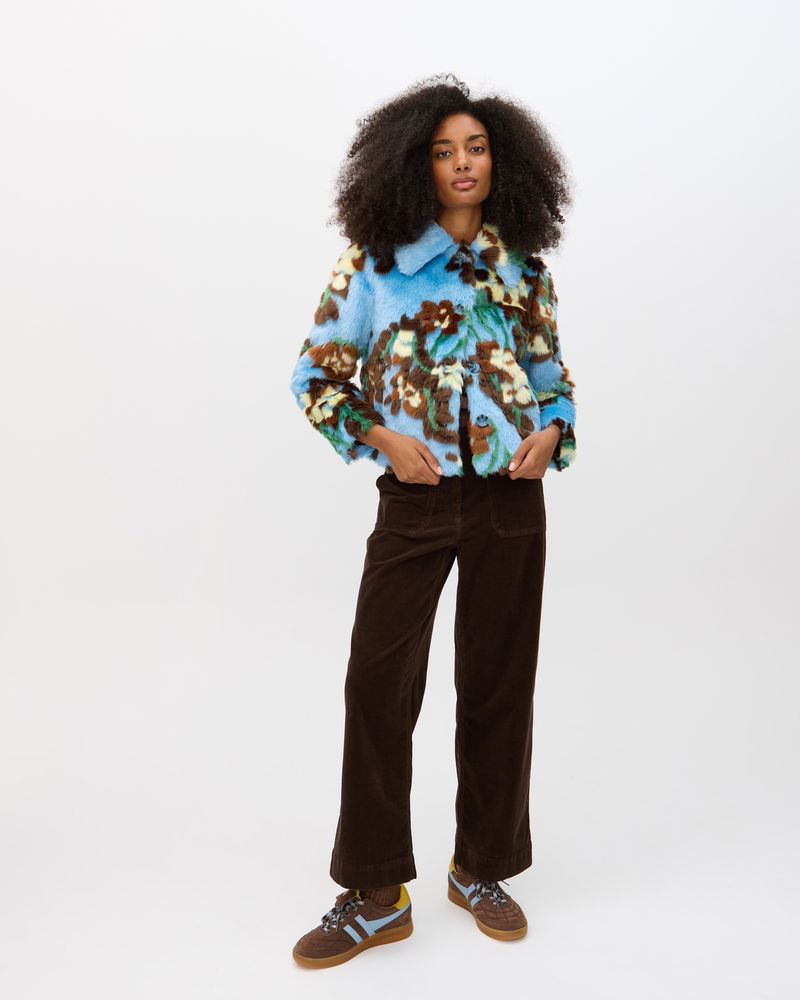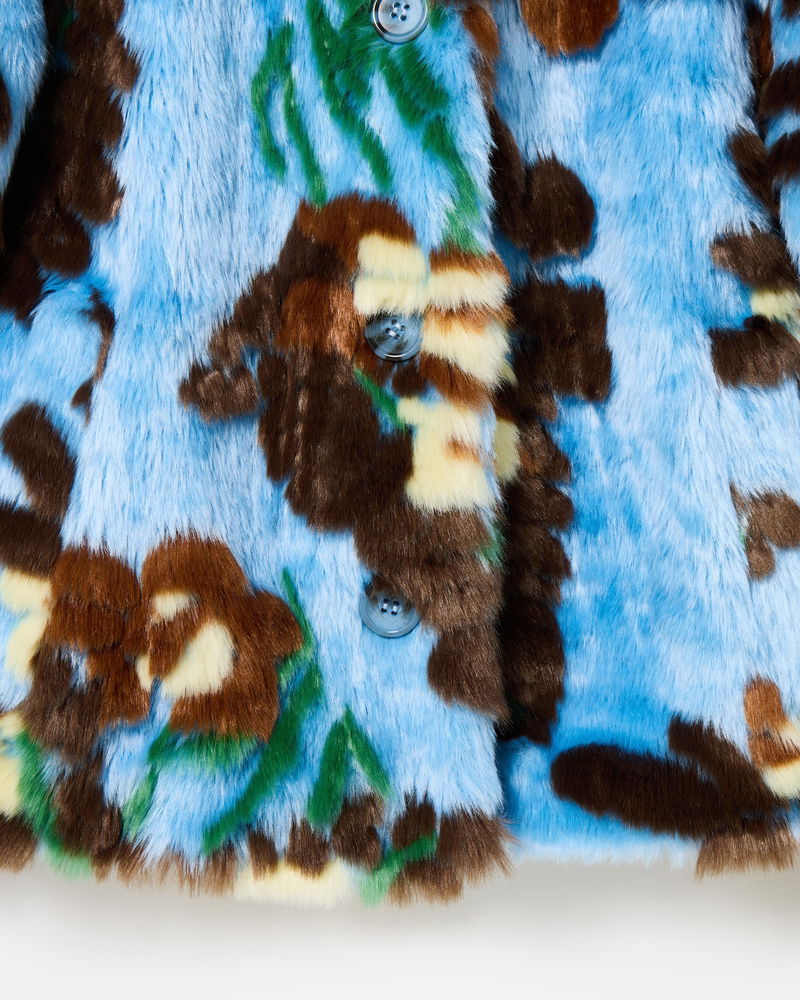 Cosy can still be a statement. This blue faux fur coat is alive with brown flowers and green vines woven through the fabric. With neat button fastenings, it is warm, plush and guaranteed to start a conversation.