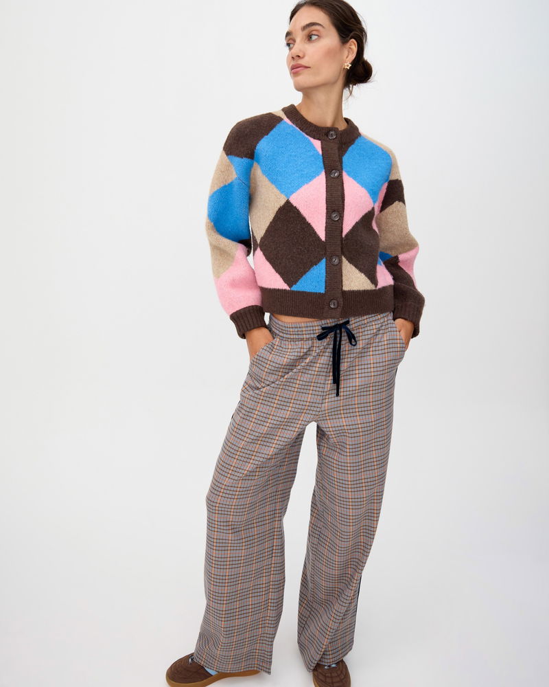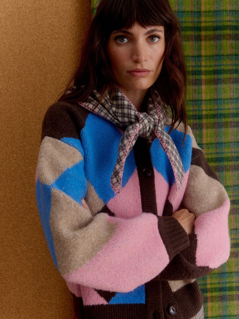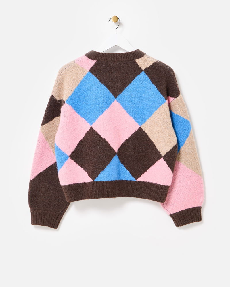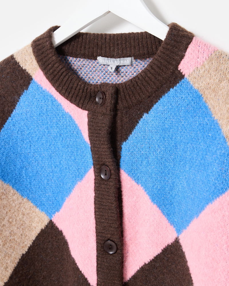 Looking for a cosy knit for layering up as the weather turns colder? Meet our diamond geometric cardigan knitted in tonal shades of blue, pink, cream and chocolate brown. Featuring an easy-wear crew neckline, ribbed trims and matching brown buttons down the front, wear solo or layer over a T-shirt or dress for added seasonal warmth to your outfit.