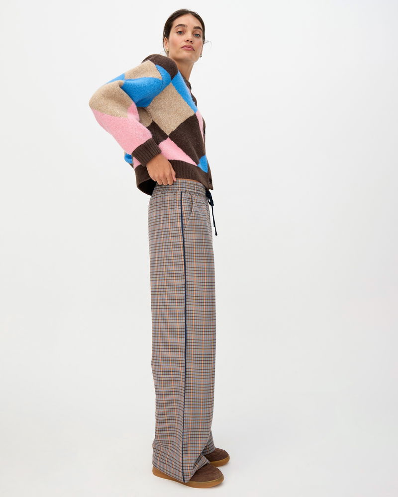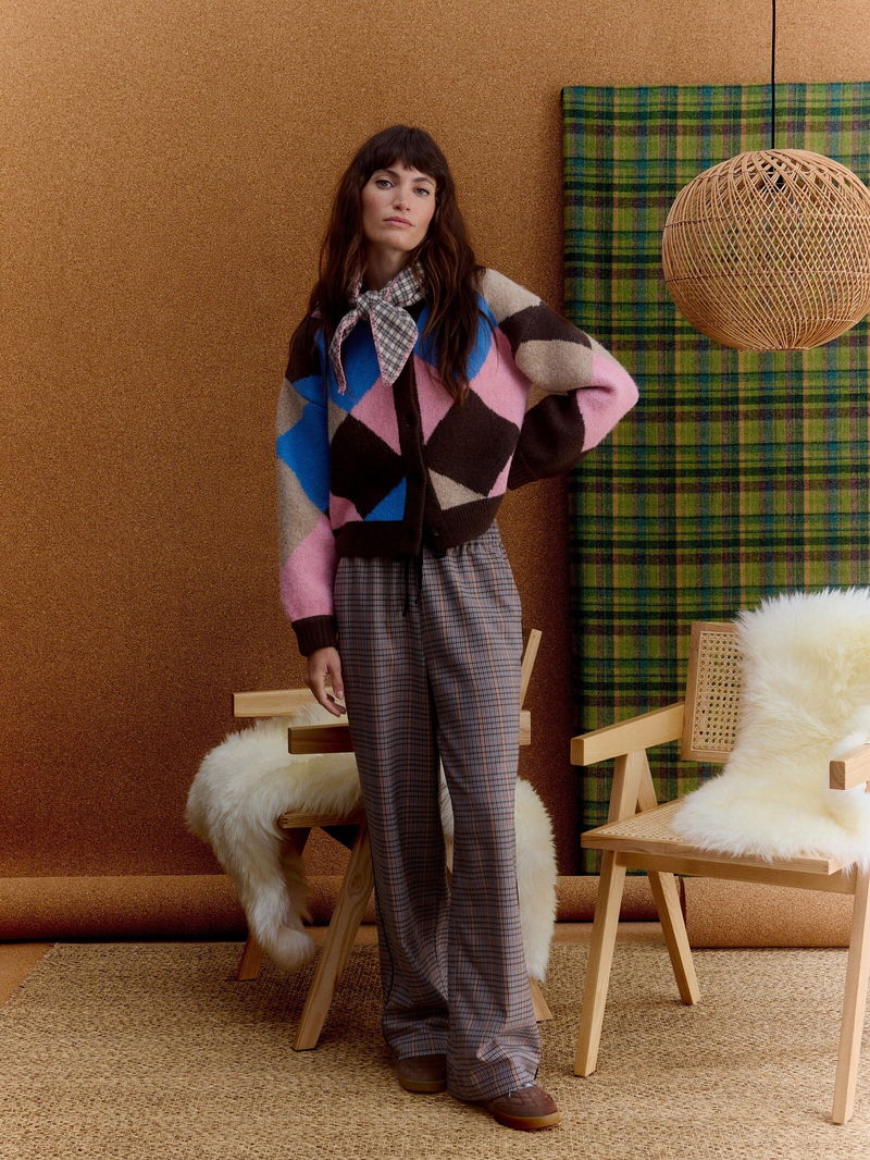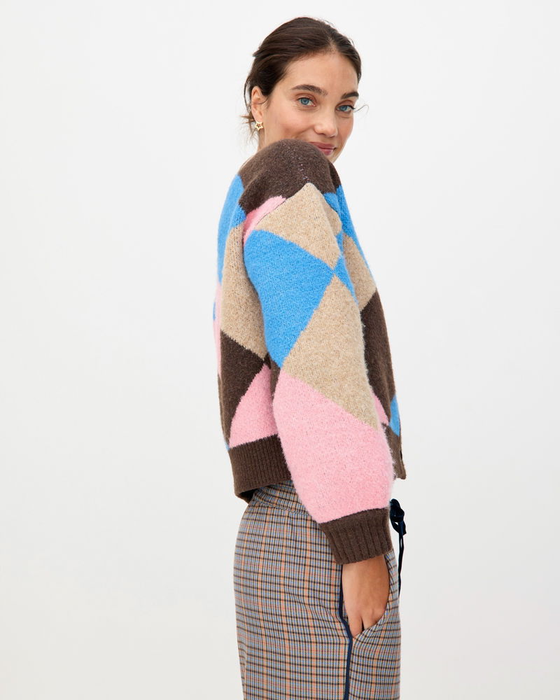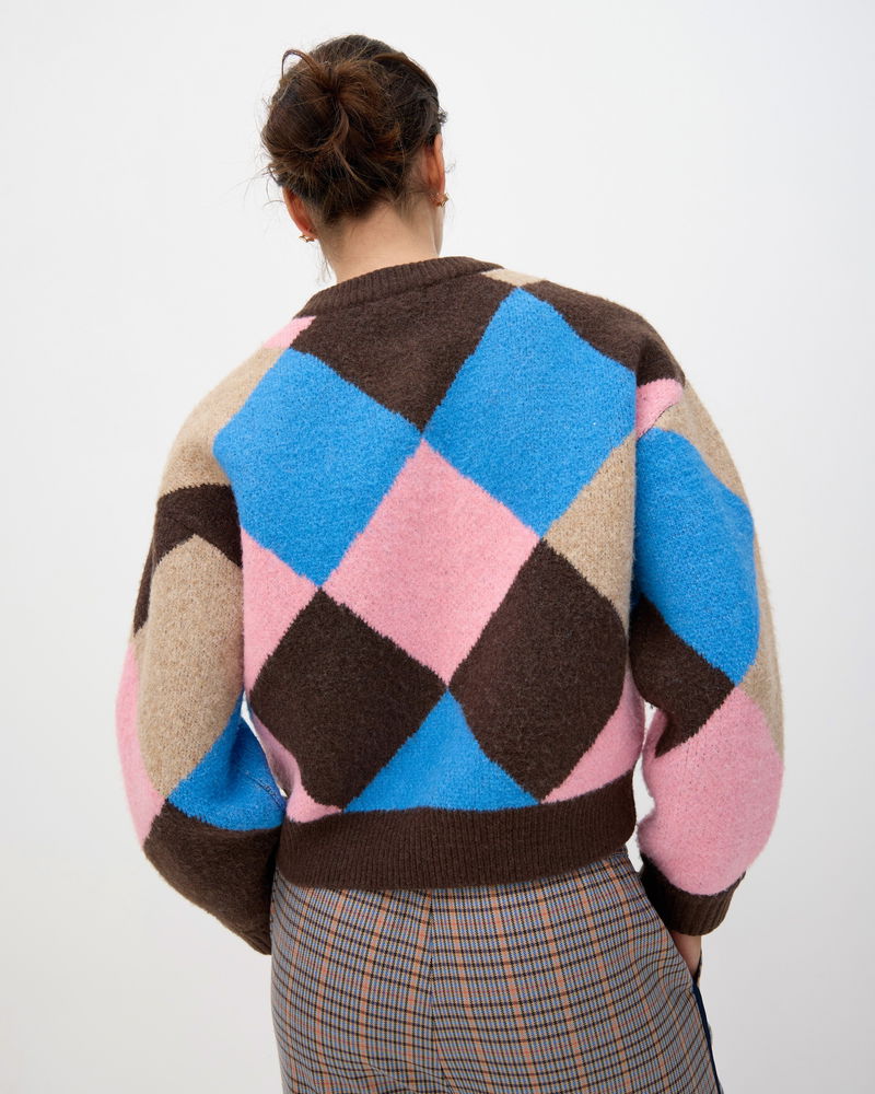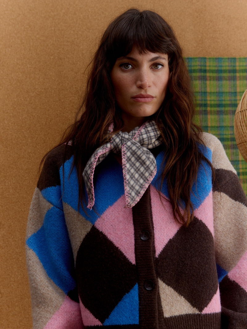 Looking for a cosy knit for layering up as the weather turns colder? Meet our diamond geometric cardigan knitted in tonal shades of blue, pink, cream and chocolate brown. Featuring an easy-wear crew neckline, ribbed trims and matching brown buttons down the front, wear solo or layer over a T-shirt or dress for added seasonal warmth to your outfit.