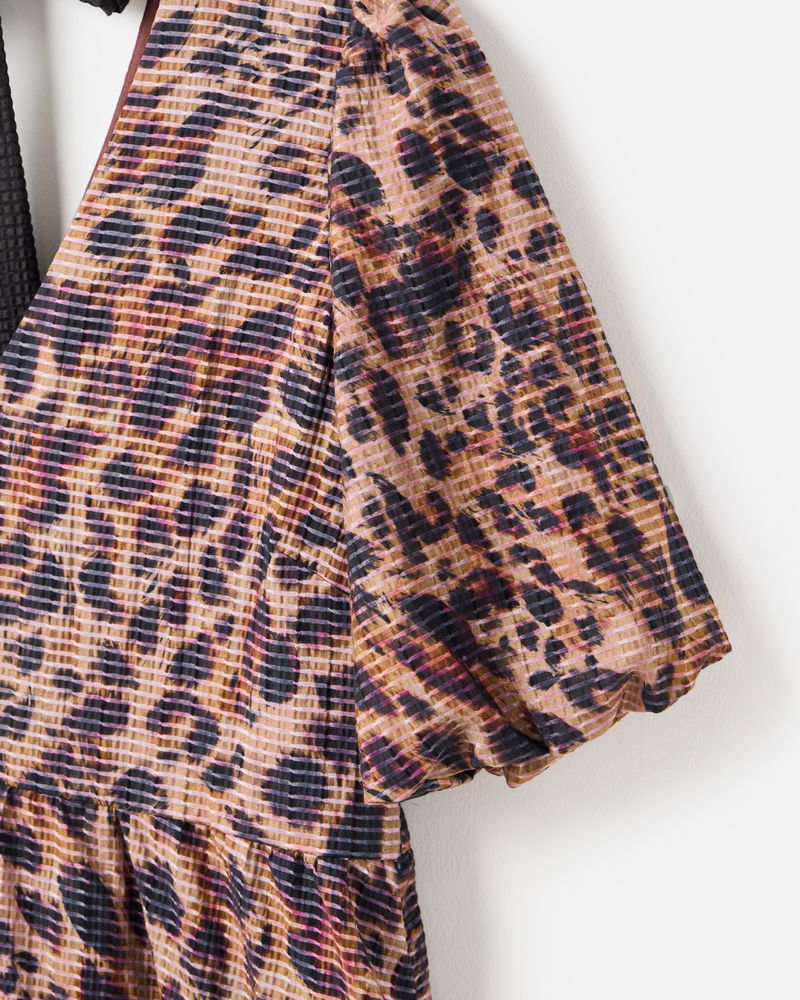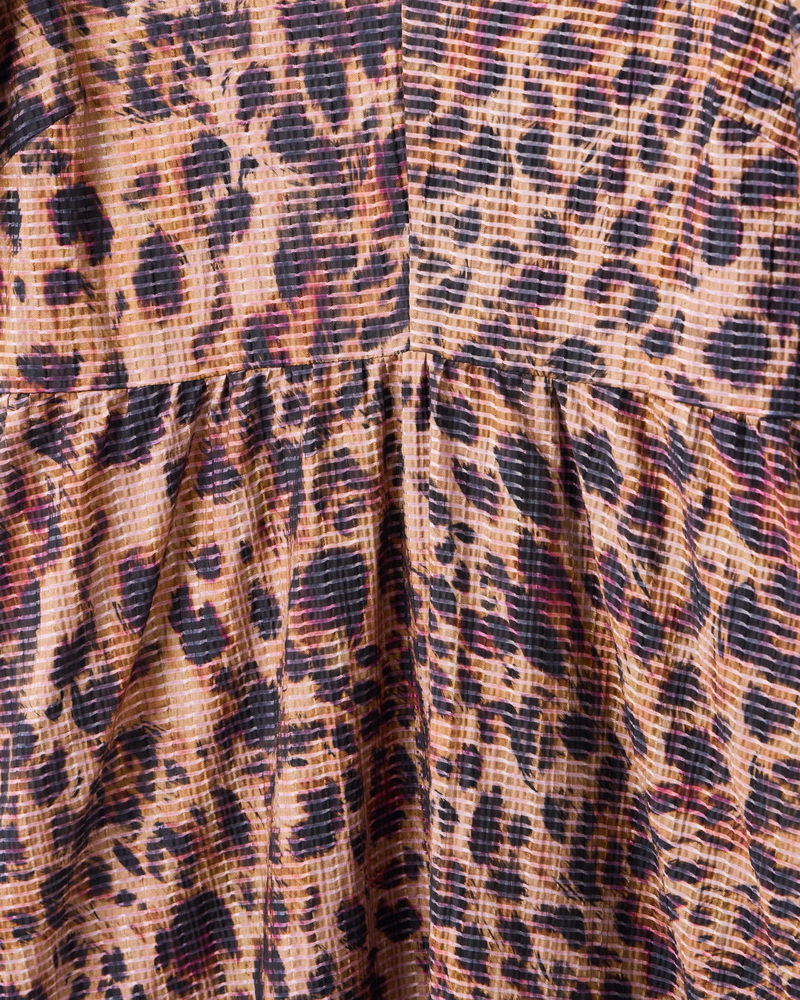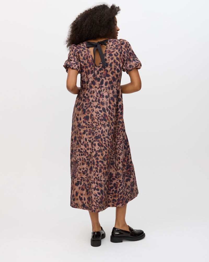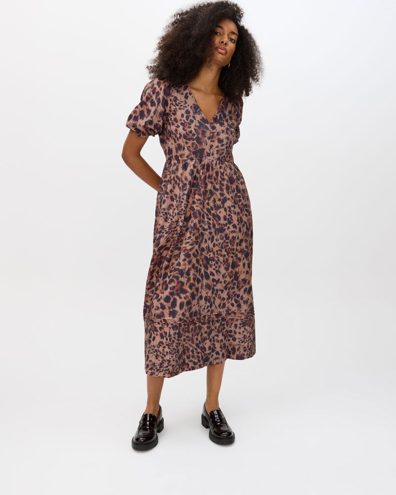 Brown Animal Print V-Neck Puff Sleeve Midi Dress