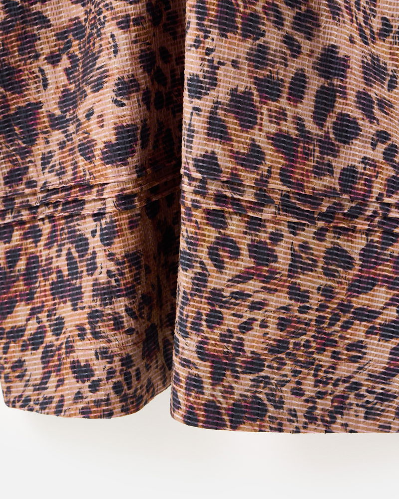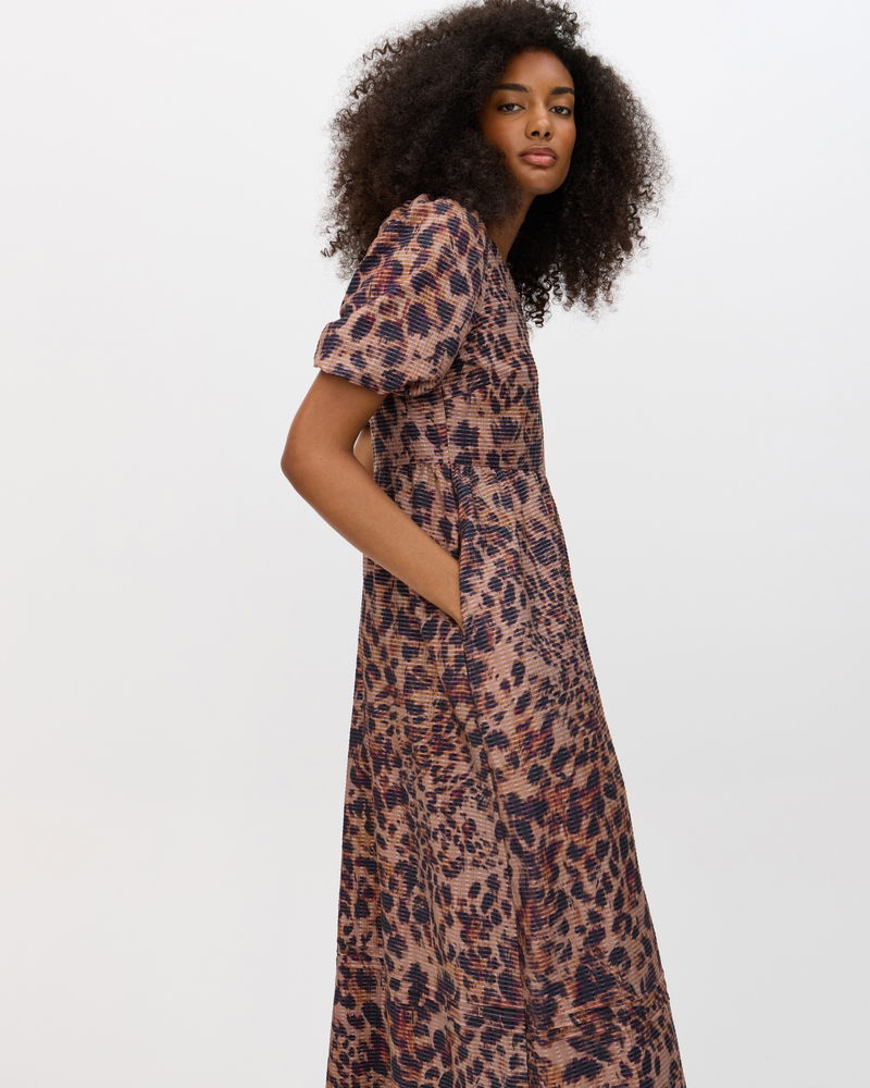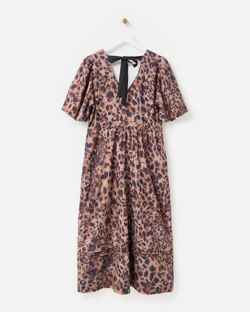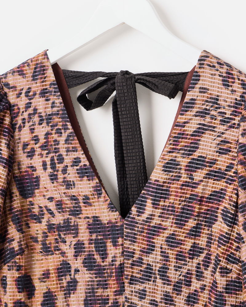 Brown Animal Print V-Neck Puff Sleeve Midi Dress