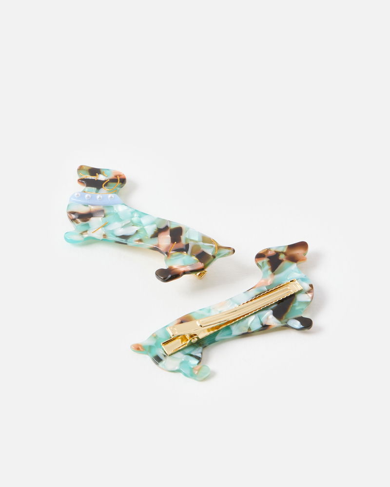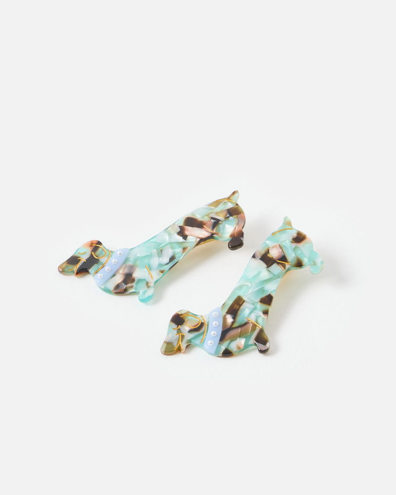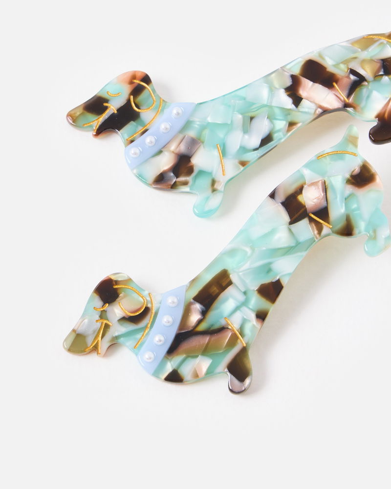 In a brown and blue faux tortoiseshell pattern, we've designed our set of two hair clips in a cute dachshund shape with gold etched detailing and mini faux pearls.