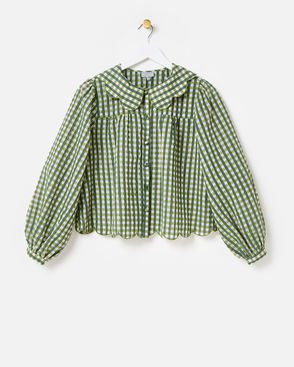 Cream short sleeve knitted top in a green checked pattern with a fluffy blue yarn detail on the corners of the grid. Designed with a collared neckline and three matching green buttons in a pearlescent finish.