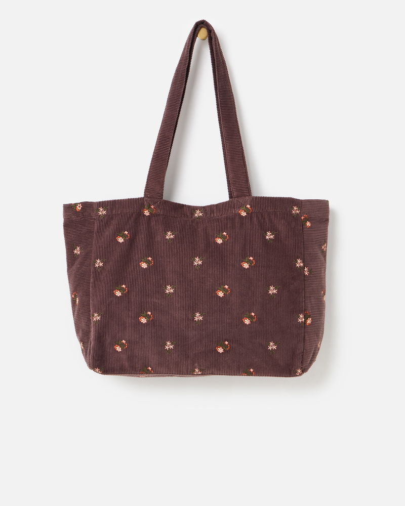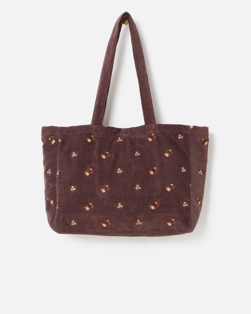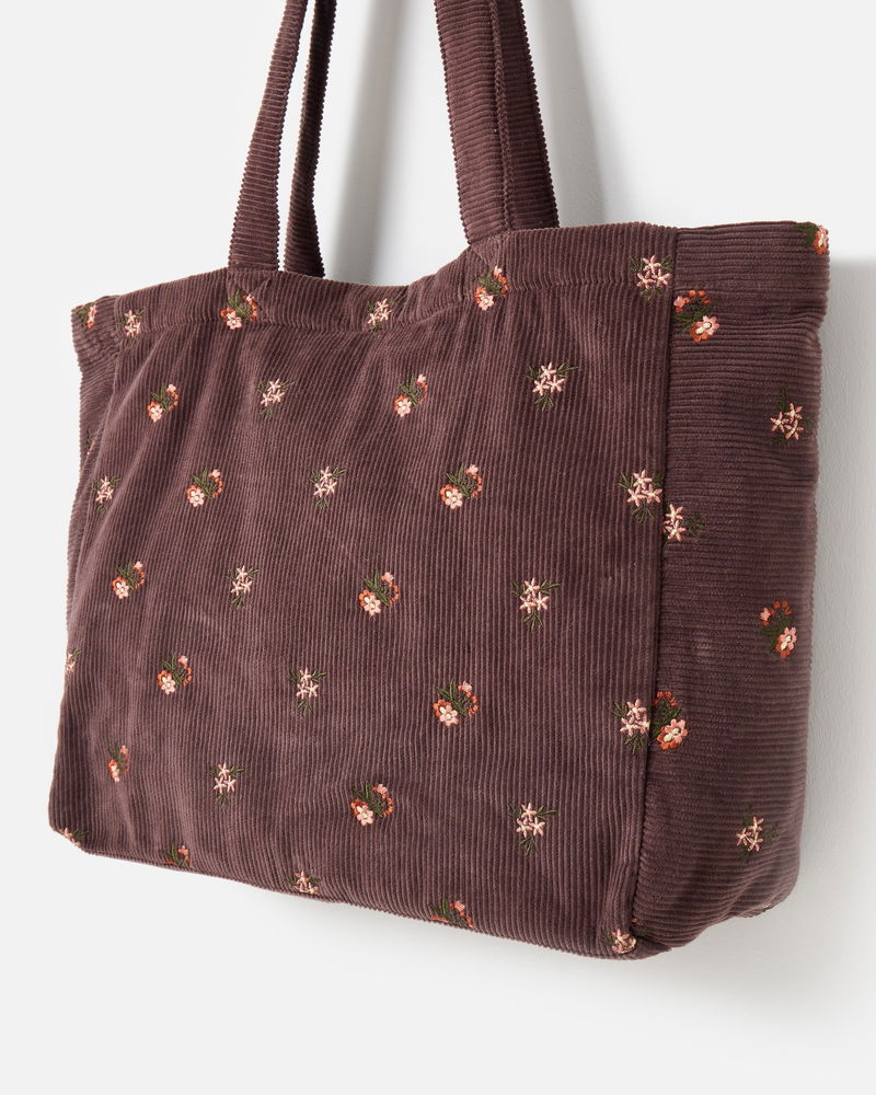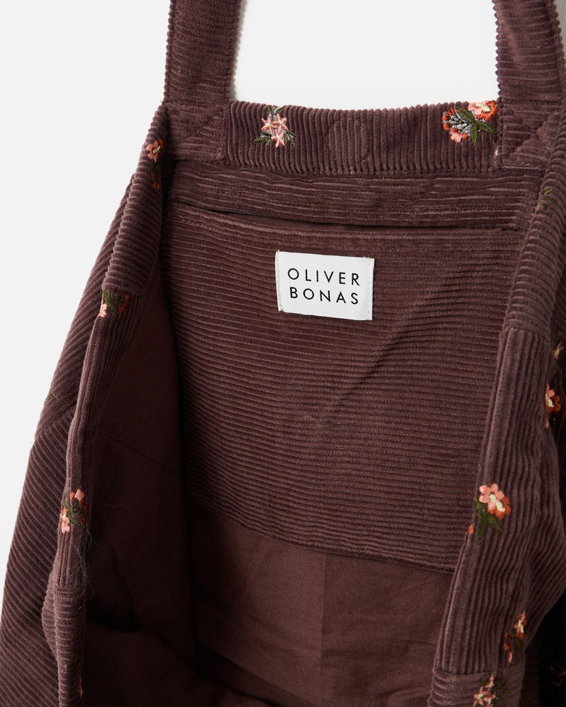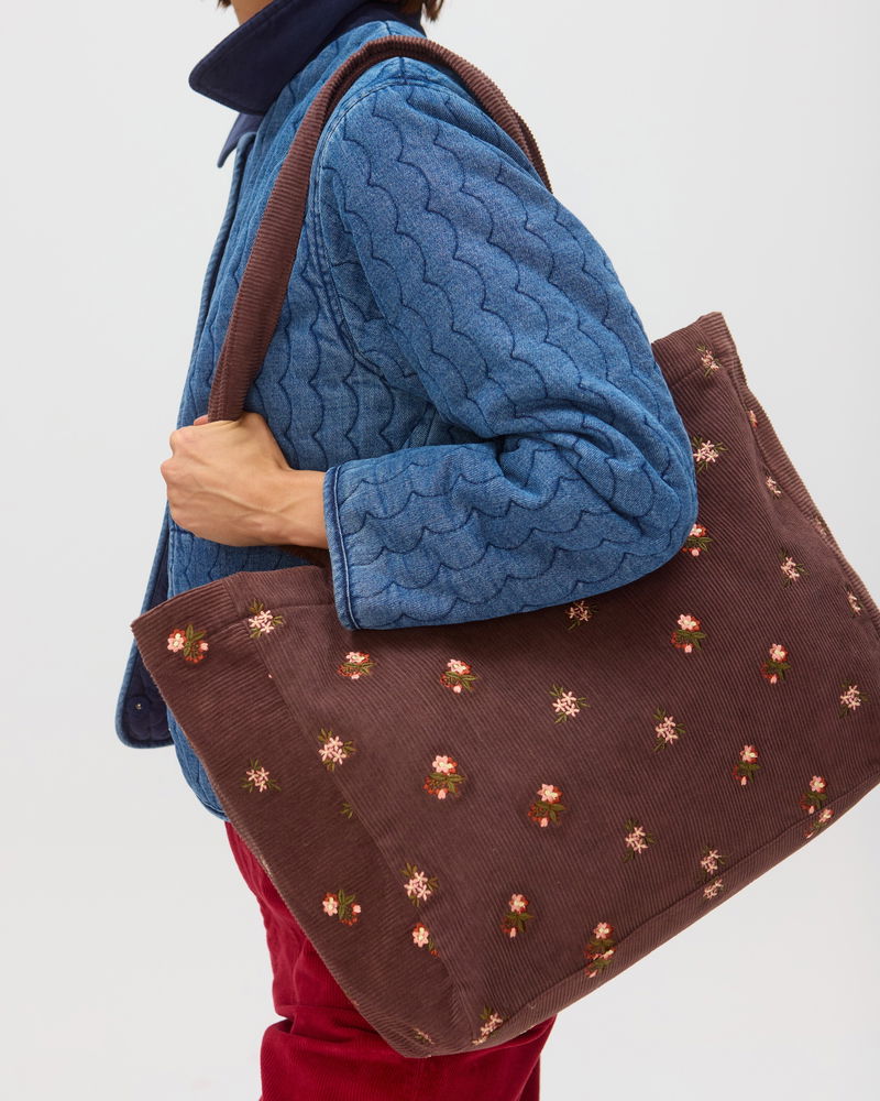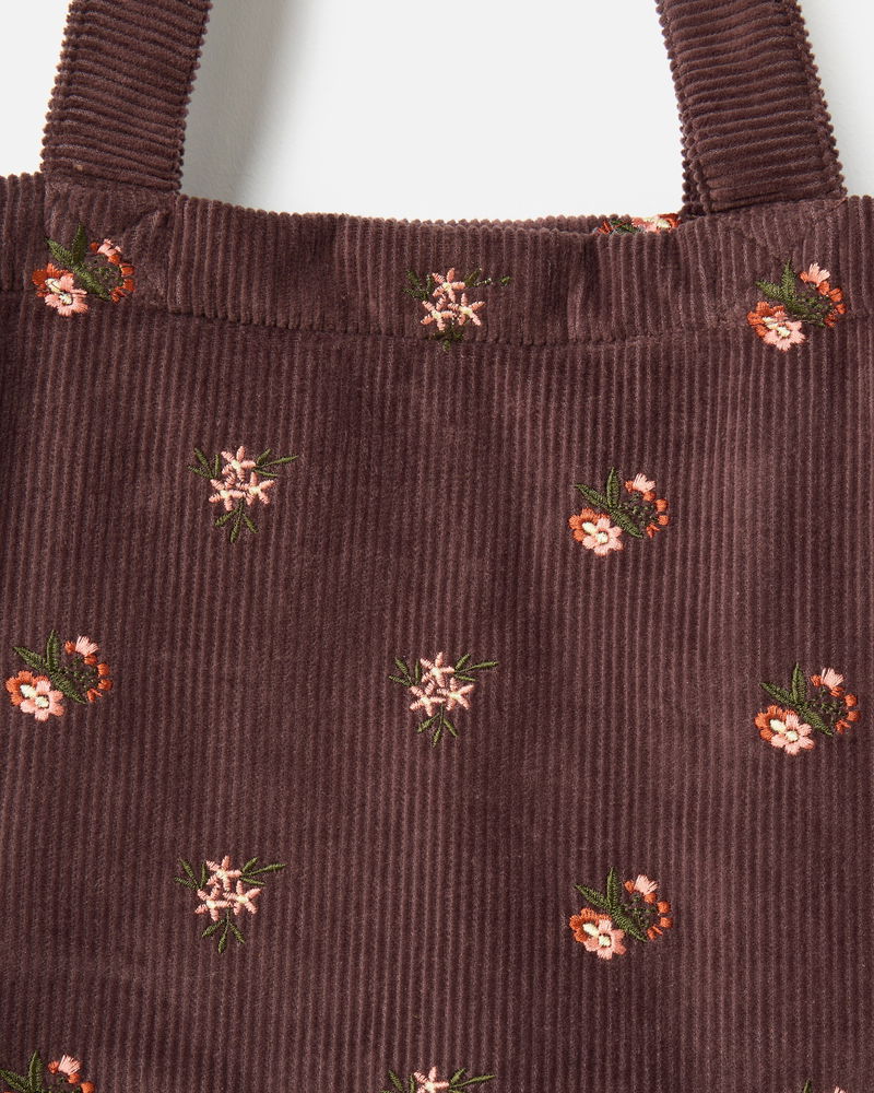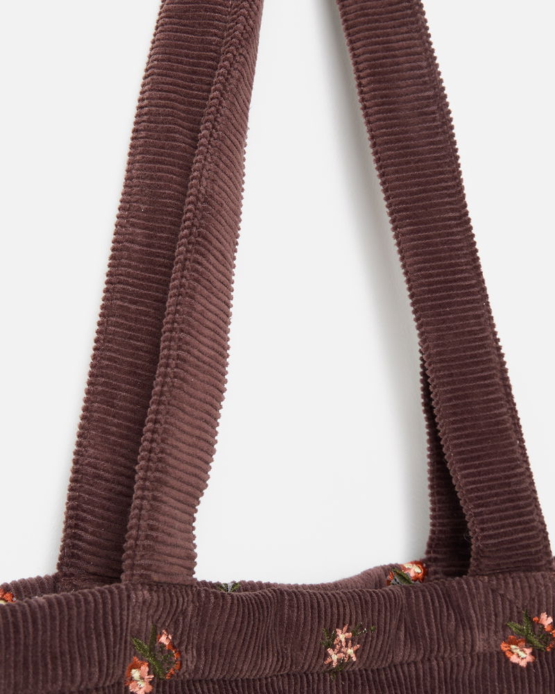 Description: Add a subtle floral flourish to your look with our rich chocolate brown cotton tote featuring pink, orange and green embroidered floral details. In a soft corduroy finish, it has plenty of space for carrying your essentials from errand runs to busy work days. Complete with matching shoulder handles and an interior pocket, it's ready for every plan you've got. Sling on your shoulder and go.