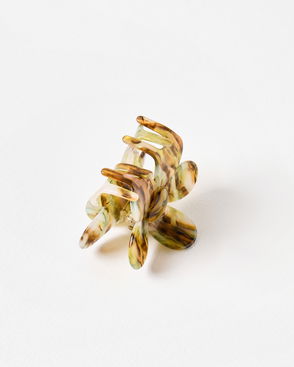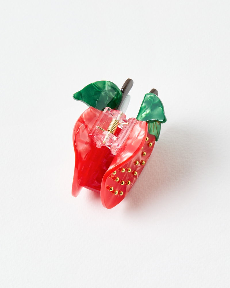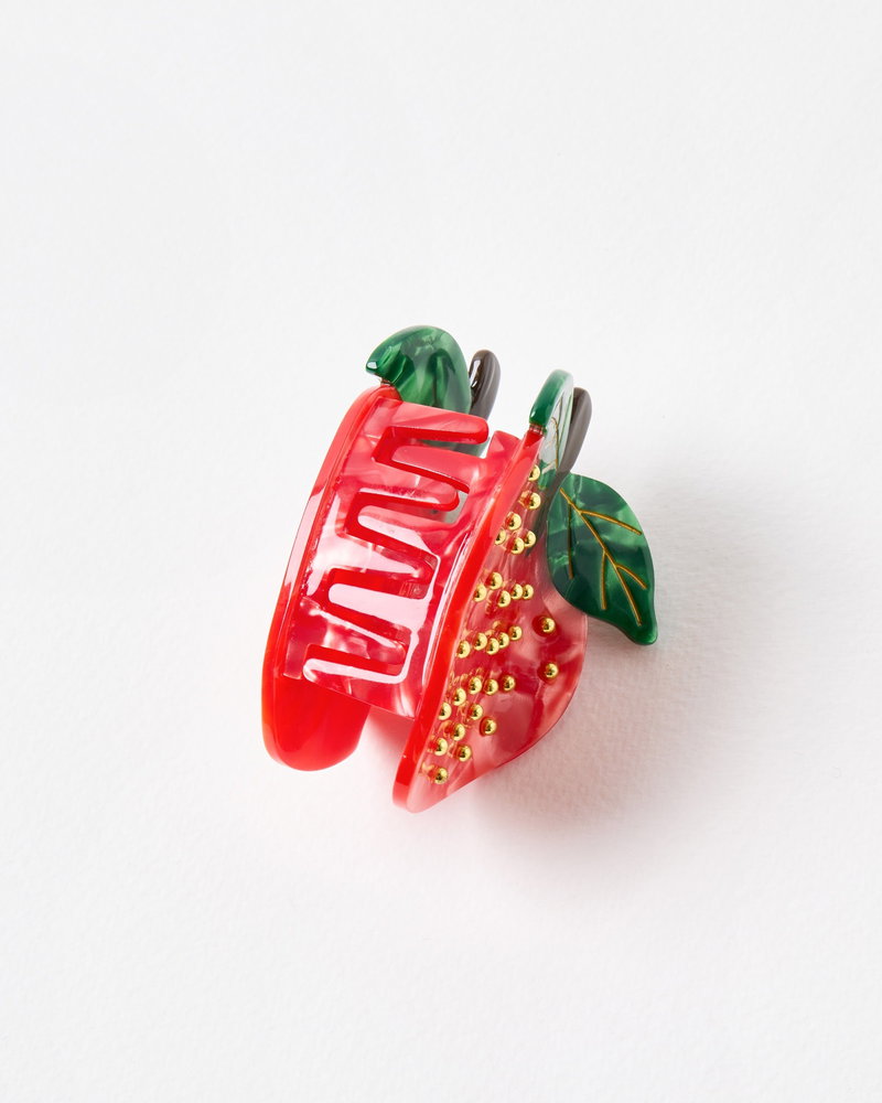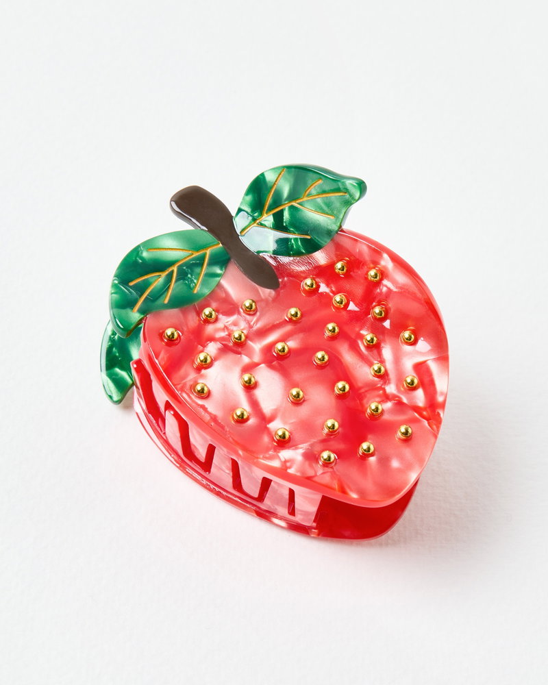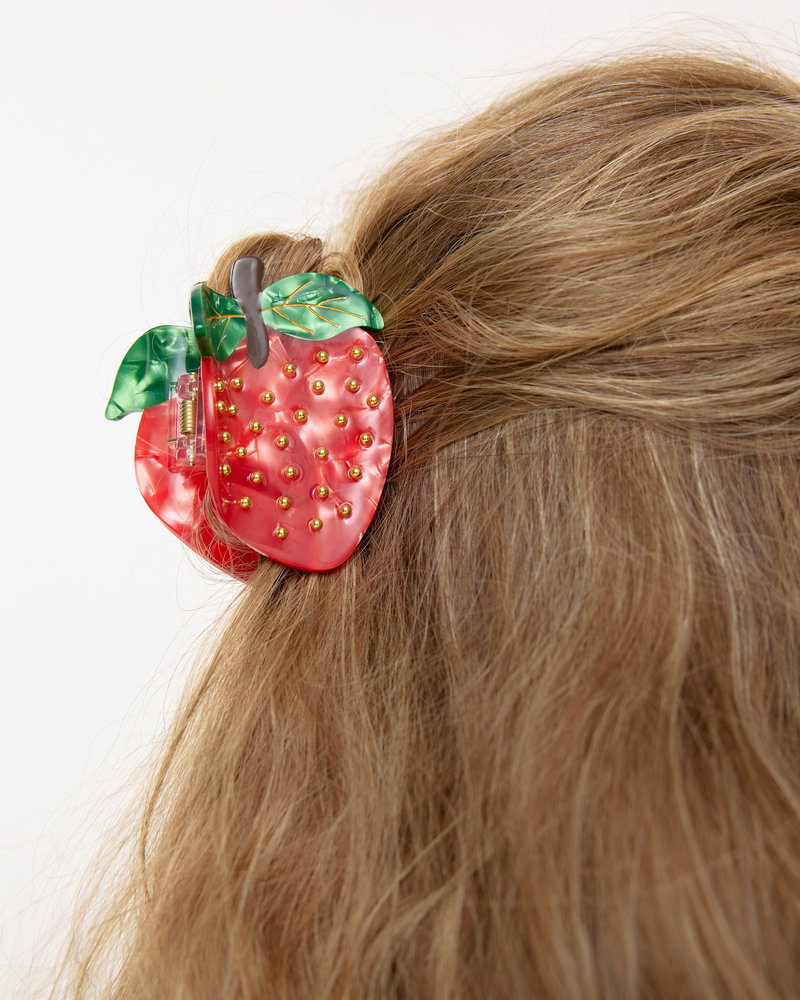 Fruity hair claw clip designed as a strawberry with tiny gold balls as seeds. It's the perfect way to add a fun touch to your summer hairstyle.