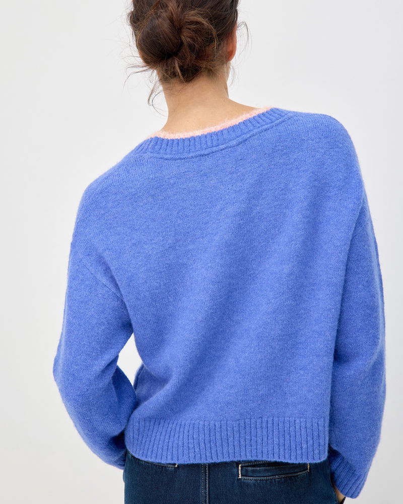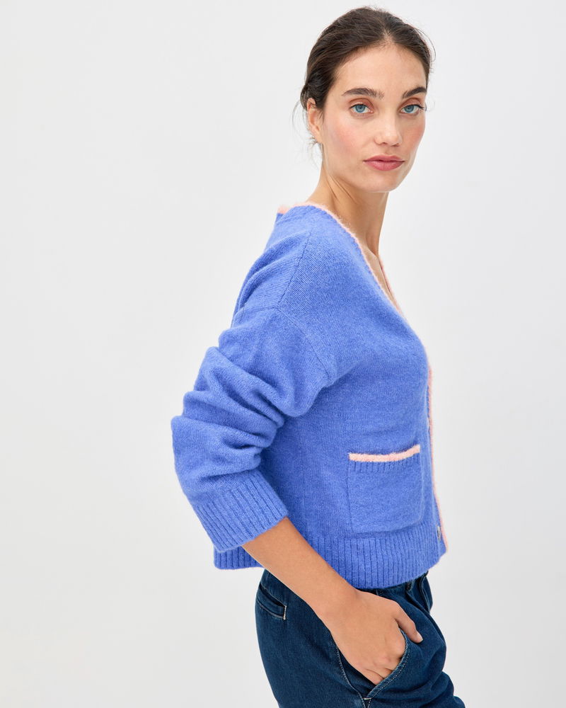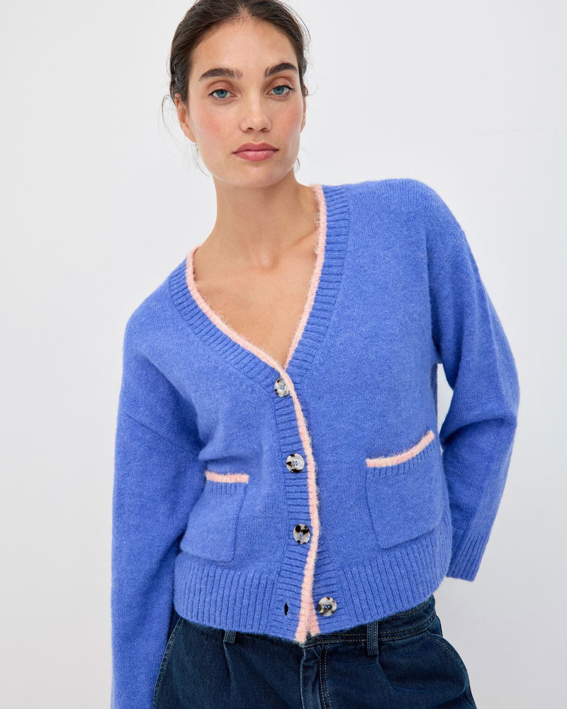 Cobalt Blue & Pink Trim V-Neck Knitted Cardigan