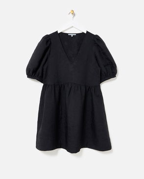 Black tiered mini dress with a contrasting white broderie pattern, V-neckline and matching fabric covered buttons down the bodice. Designed with a matching tie waist belt, pleated shoulders and elasticated cuffs on the three-quarter length sleeves.