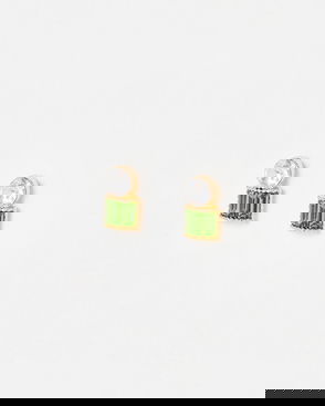 Gold toned chain drop earrings consisting of a central drop of clear oval stones, with a small green stone outline. Finished with a stud earring back for easy, comfortable wear.