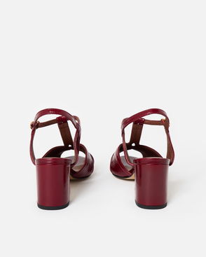 Heeled slingbacks made from a soft red velvet with a buckle fastening, strap across the foot and square toes.
