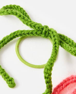 Statement bow headband printed with a retro-inspired floral pattern in bright shades of green, light blue, brown and cream.