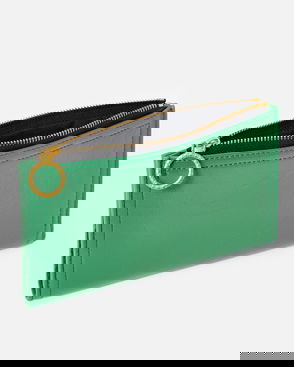 In a rich green hue, this zipped purse folds out to reveal a clear ID slot, card pockets and a small zipped pocket, with golden metalware and lettering.
