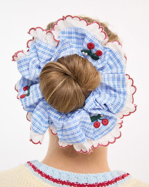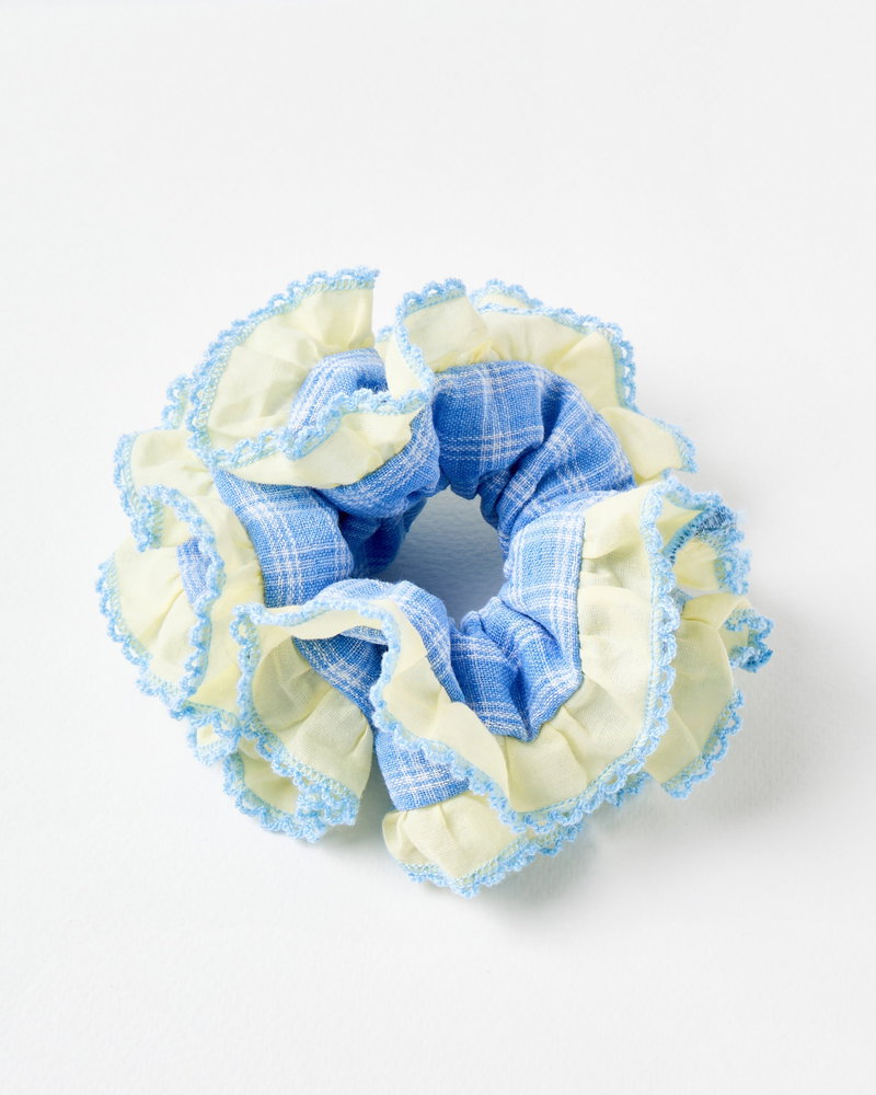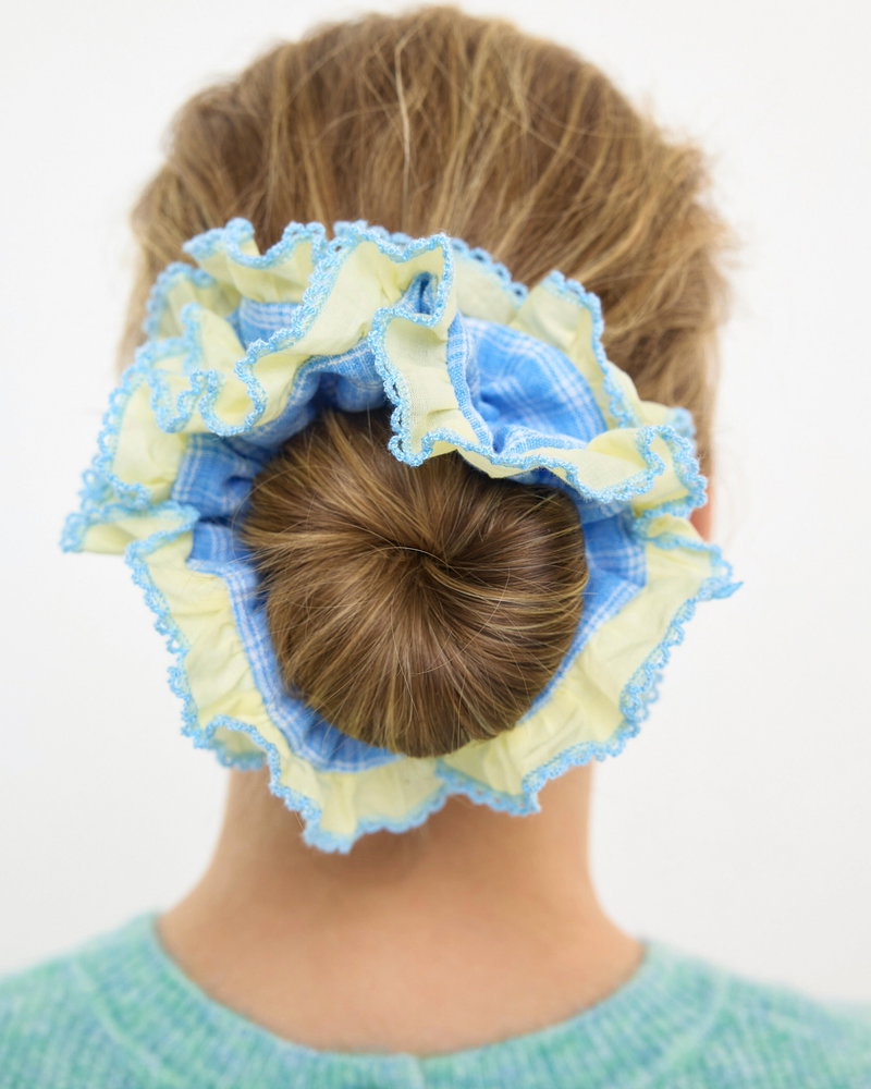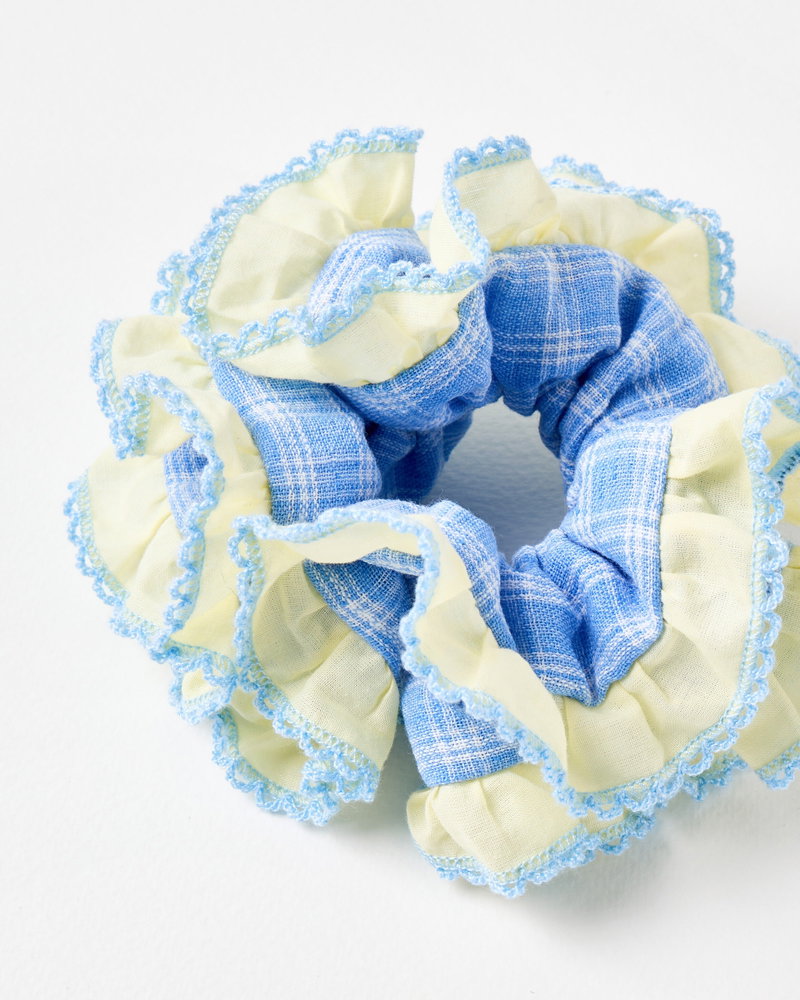 Larissa Blue & Yellow Checked Frill Trim Scrunchie