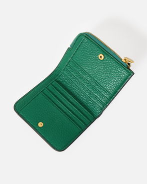 Green zipped purse with two zipped compartments, extra card slots, and gold zip with a matching loop.