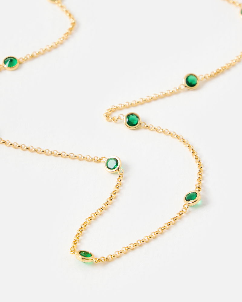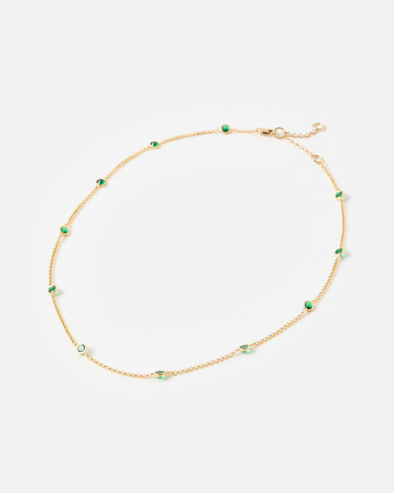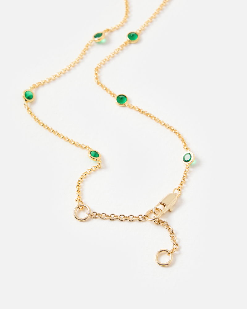 Dainty gold tone chain necklace interspersed with small green stones. Layer with matching gold jewellery for a co-ordinated necklace stack.