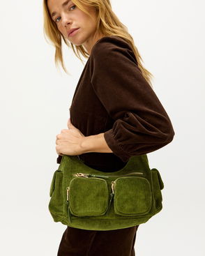 Khaki green crossbody bag with two zipped pockets, leopard print woven strap and compact rectangular shape.