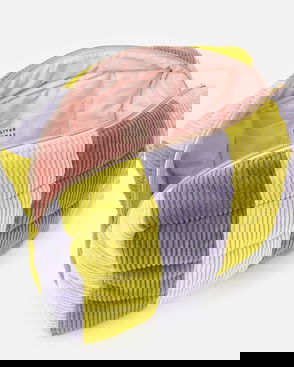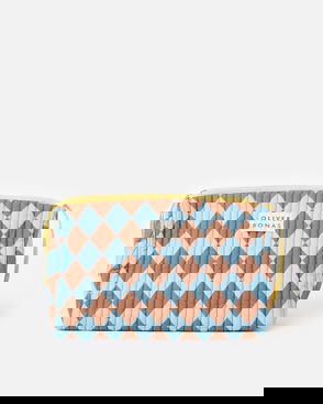 Medium fabric wash bag made from corduroy fabric, fashioned in a colourful patchwork pattern inspired by our patchwork quilt designs. In soft pink, blue and yellow tones, this wash bag features a green inner lining, zip closure along the top and a green fabric toggle. Use to store beauty tools and essentials during your summer holidays and travels.