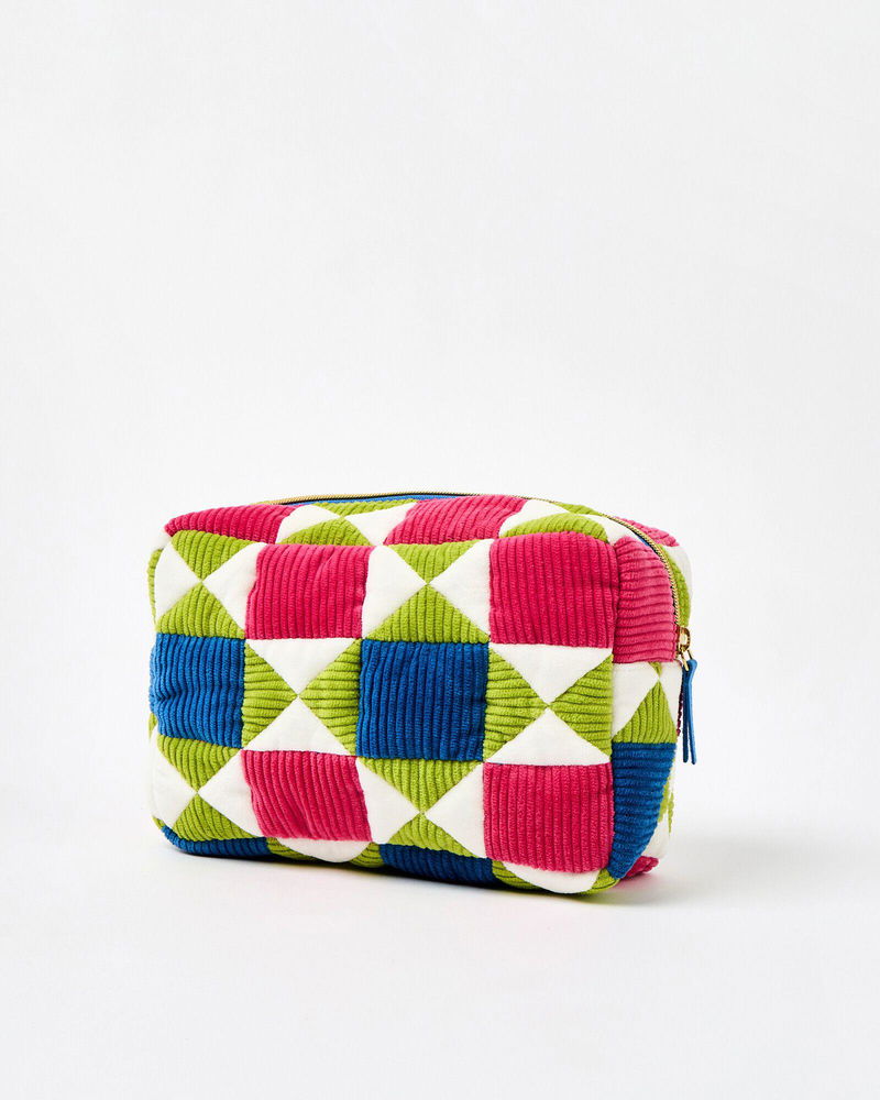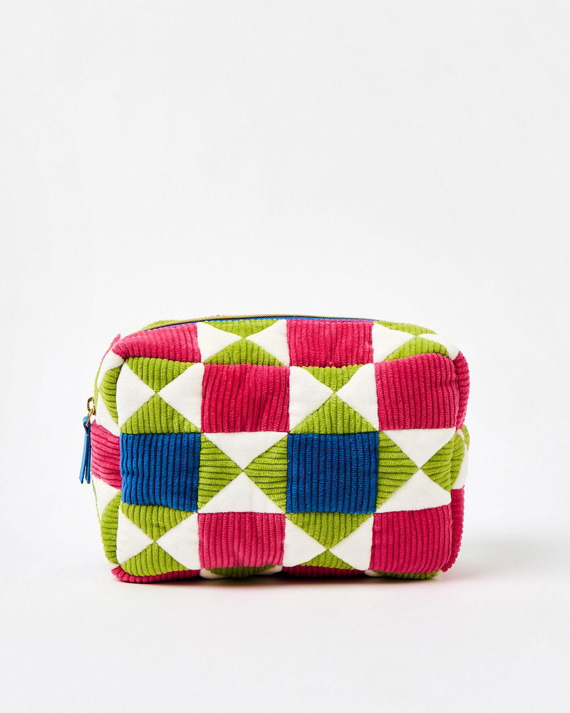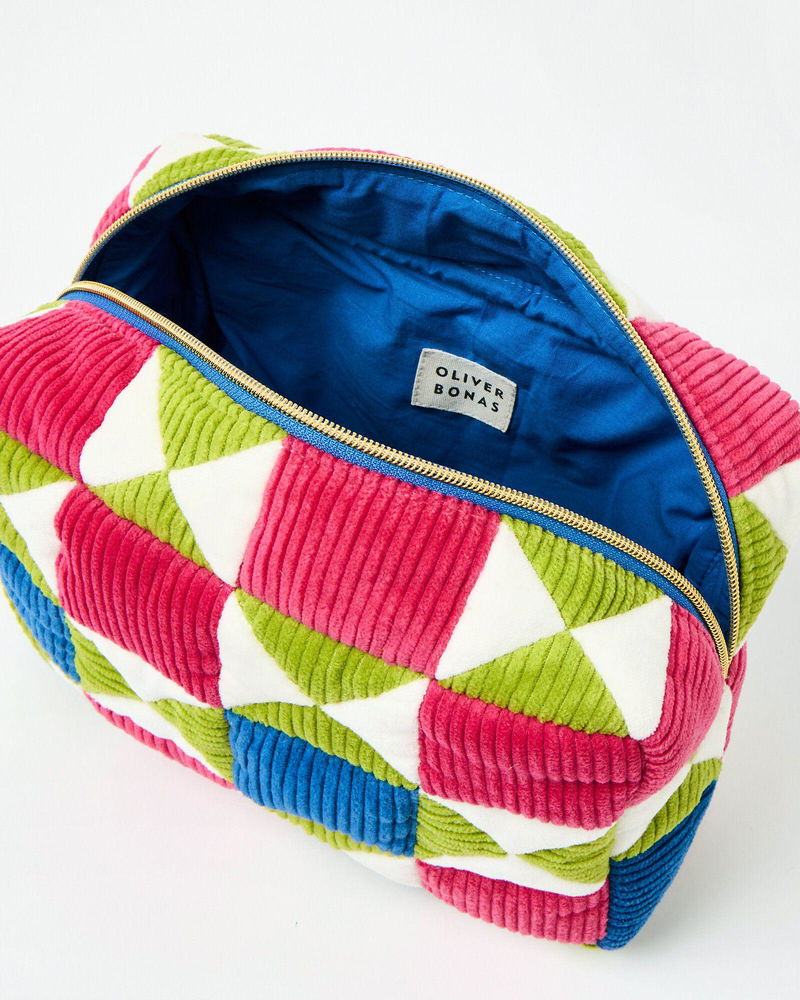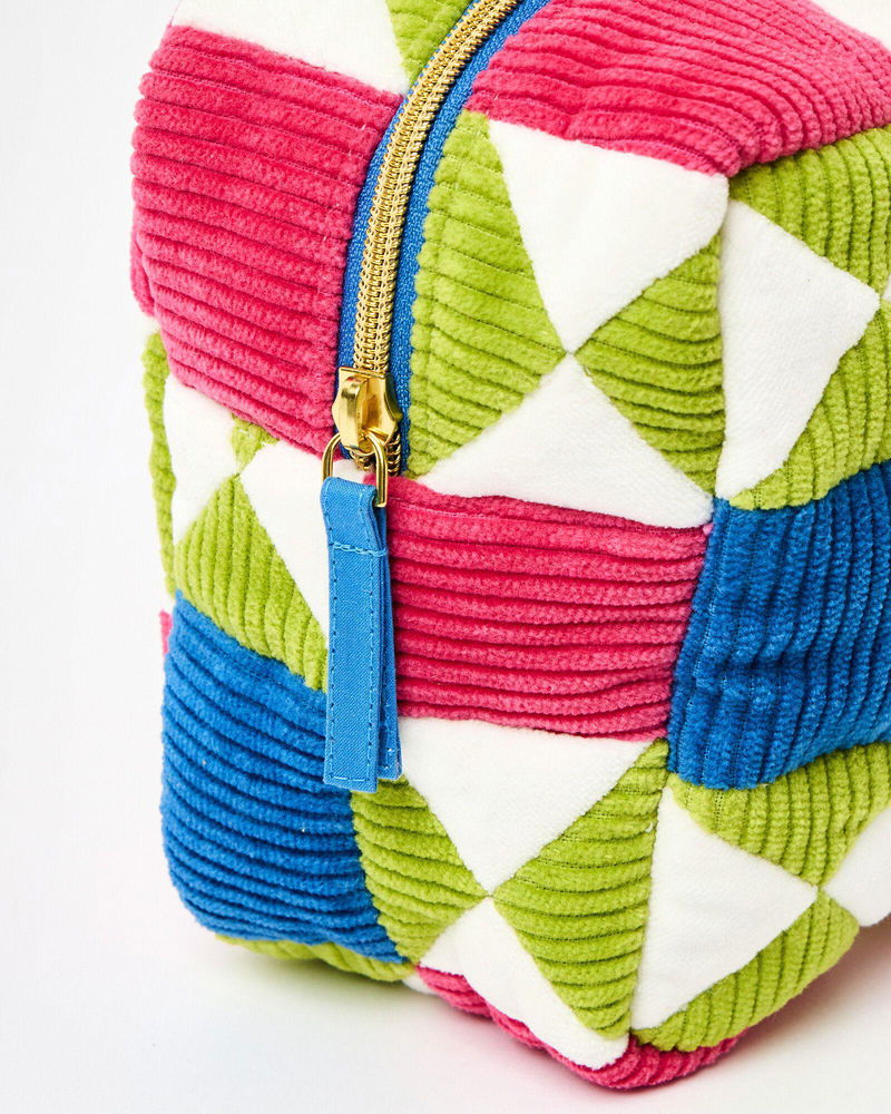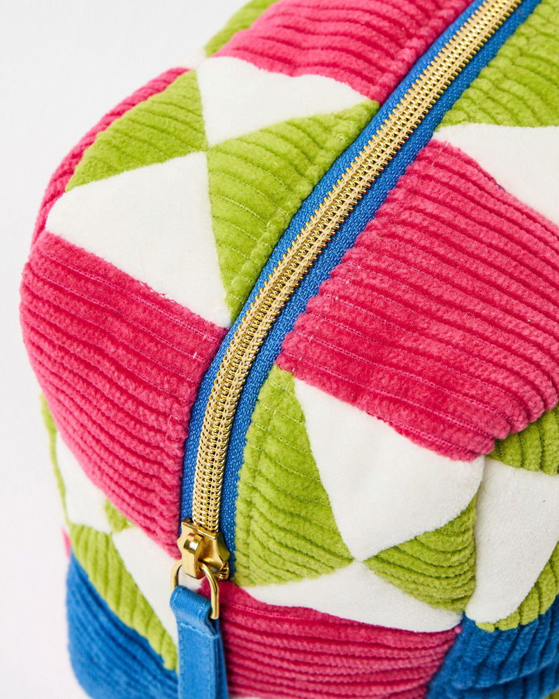 Fabric wash bag made from patchwork pink, green and blue corduroy sewn in a geometric pattern.