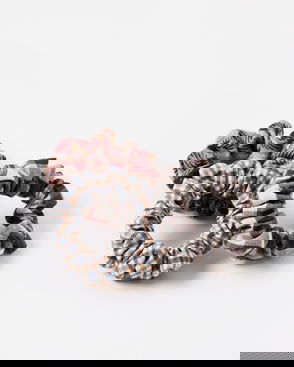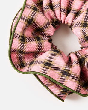 Set of three mini hair scrunchies including two with a floral broderie pattern in green and orange, and another in a green and white striped pattern.