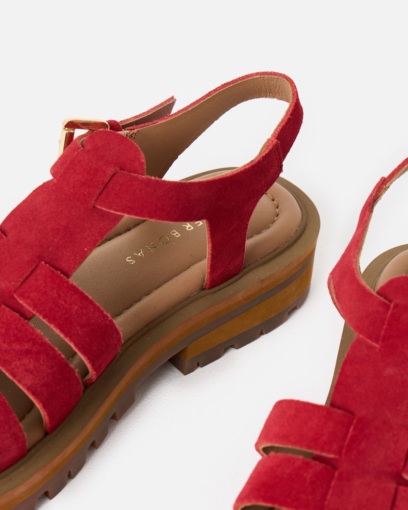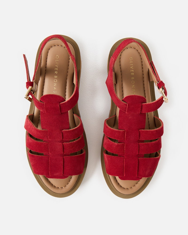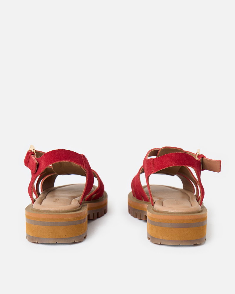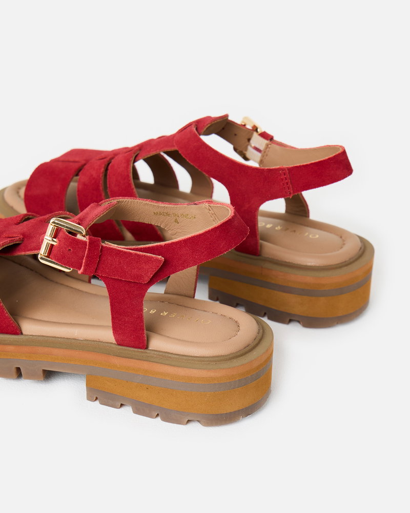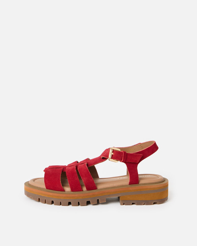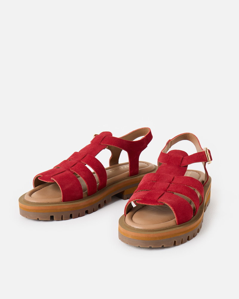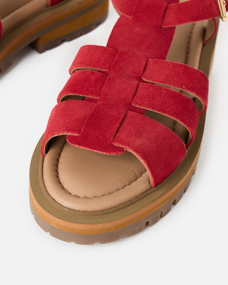 Get summer ready with our red suede chunky fisherman sandals. With three straps across the foot and an open-toe design, they feature a gold buckle fastening at the ankle. Designed with a padded footbed and chunky brown sole, they offer both style and support for all-day wear.