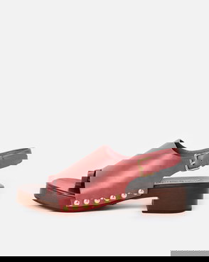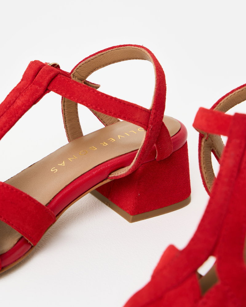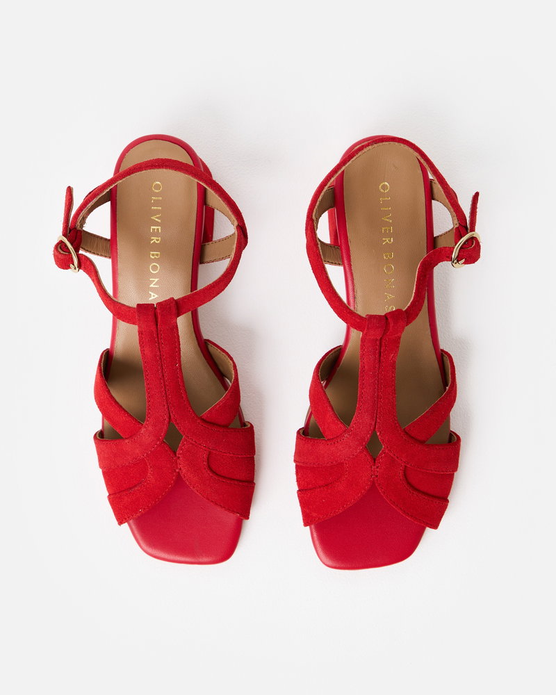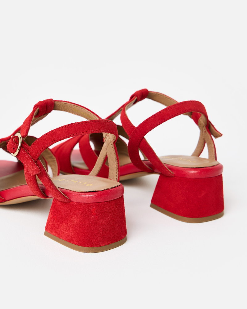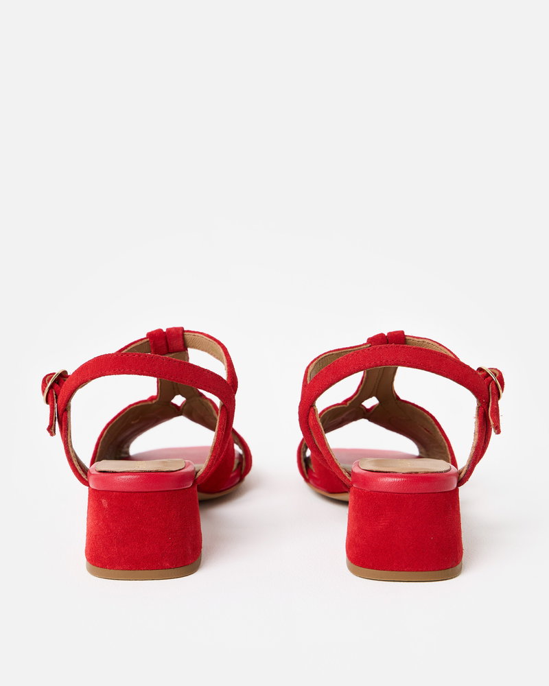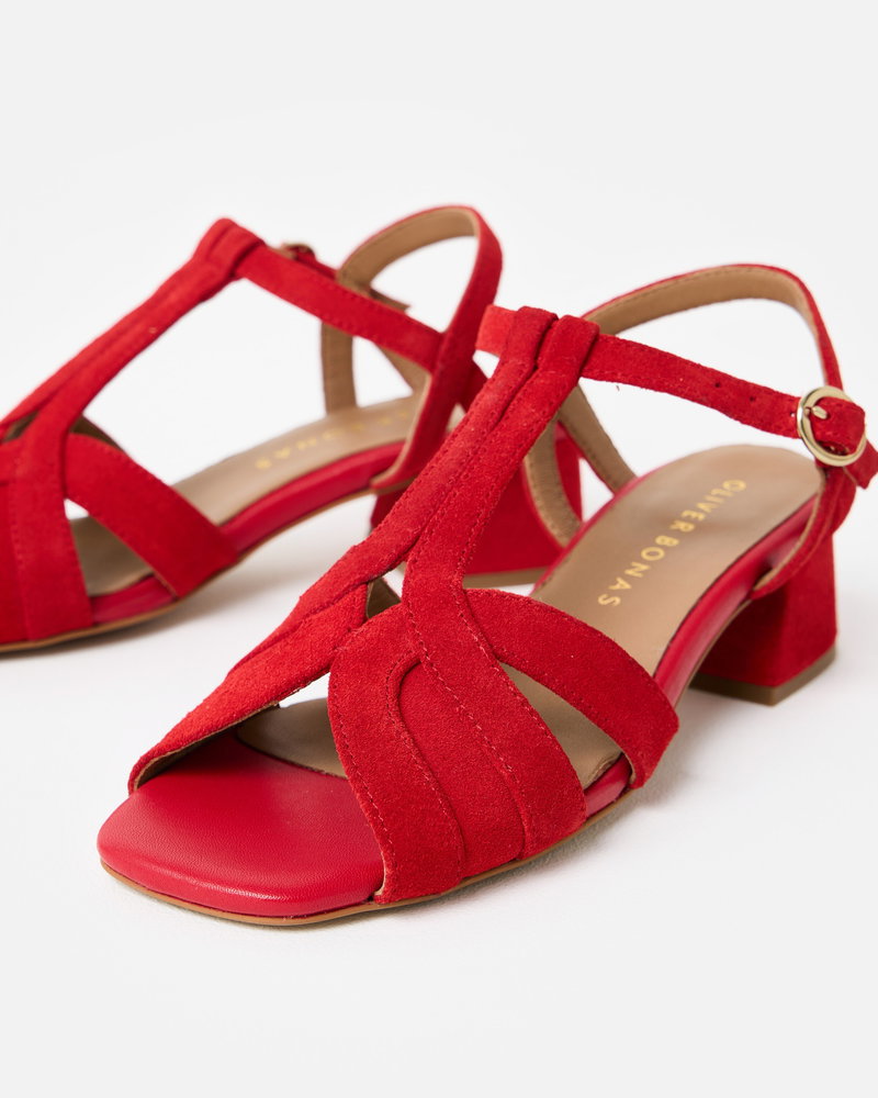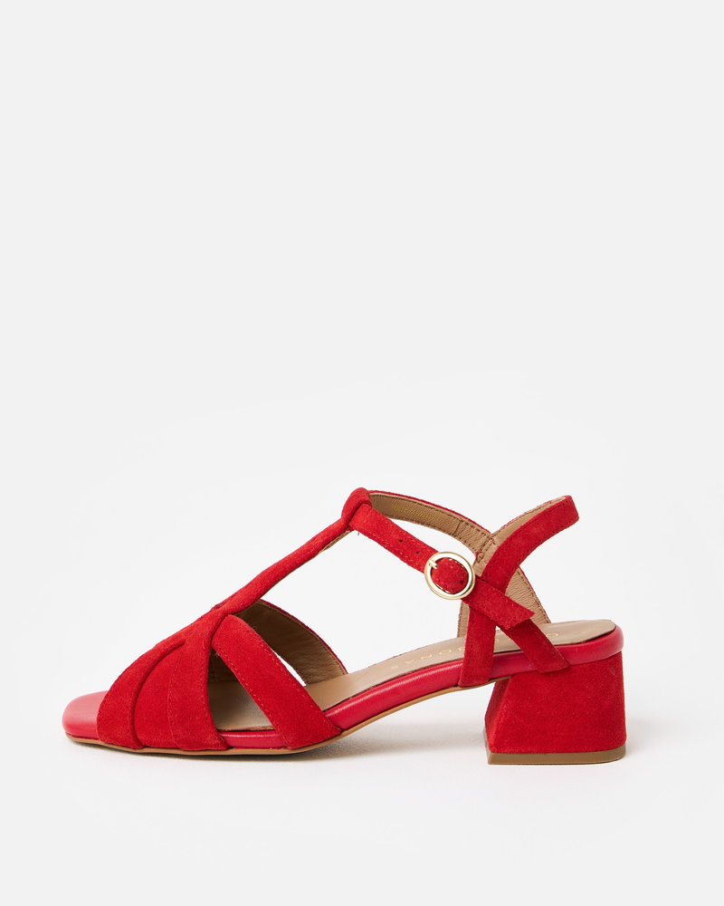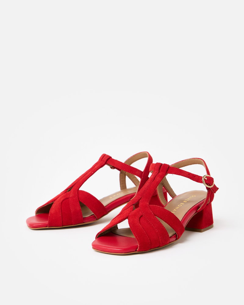 In a rich red suede, these heeled sandals bring a warm pop of colour to summer looks.