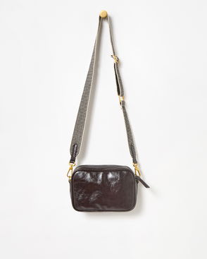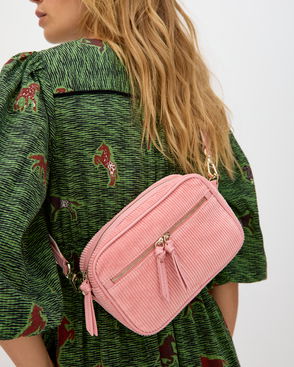 Gold crossbody bag with a monochrome stripy strap, two zipped pockets and an embossed logo on the base. Adjust or remove the strap to wear across the body or shoulder.