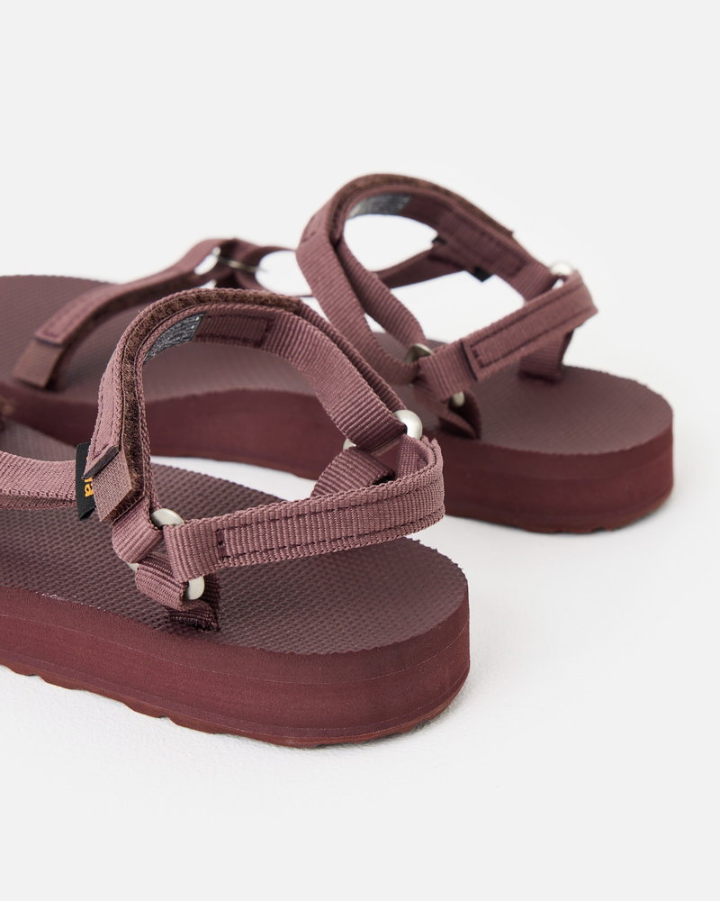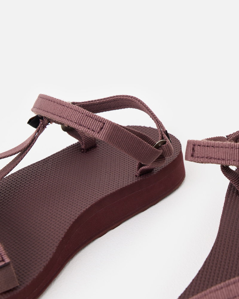Dark purple strappy Teva sandals with easy hook-and-loop closures secured by velcro fastenings. Designed with a recycled rubber sole and quick-dry webbing, they're perfect for all-day wear and even water activities.