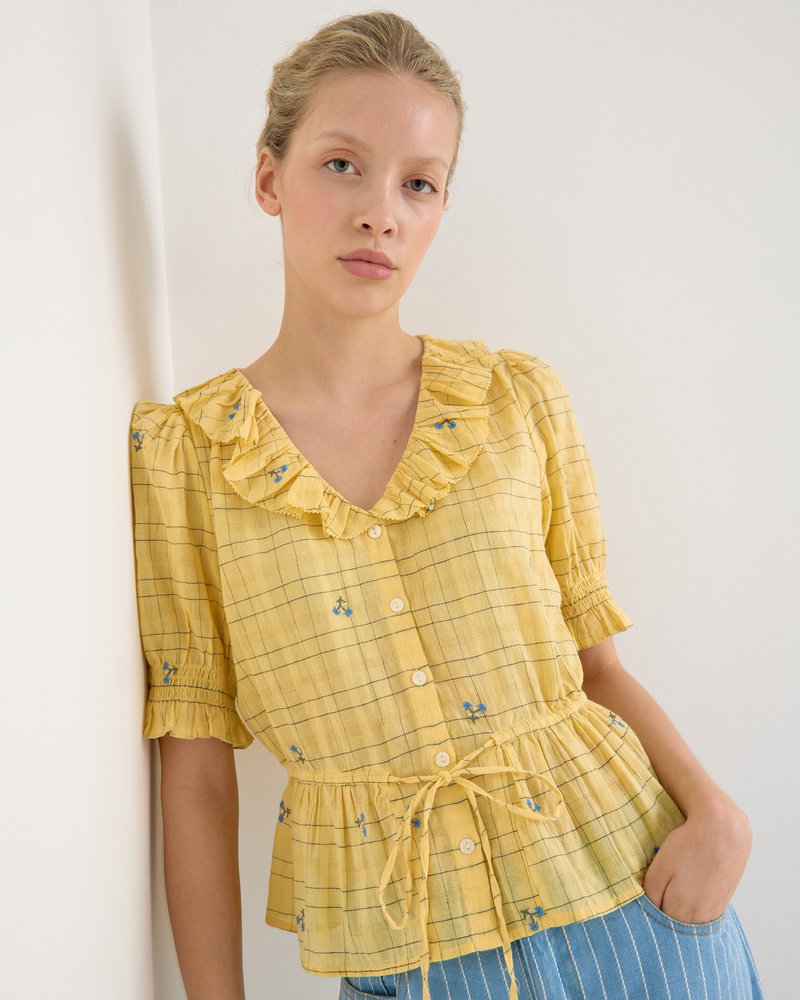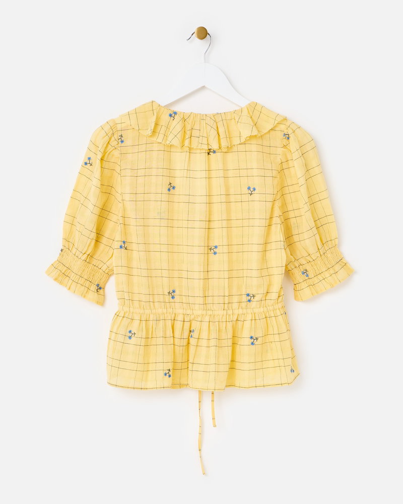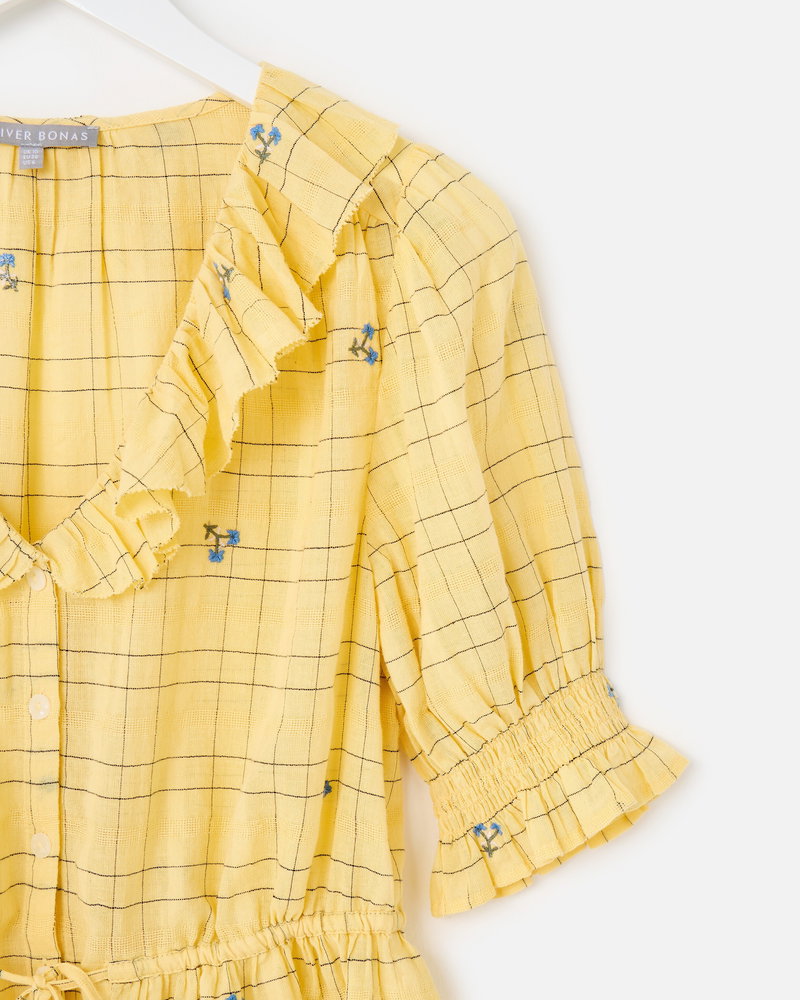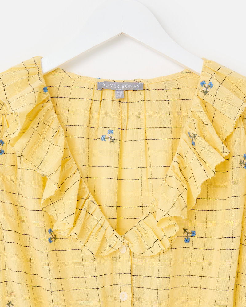 They've designed the sunshine yellow blouse with a black checked pattern accented with blue floral embroidered details. With cream buttons down the front and short sleeves with a gathered detail, they've added a frill collar to the V-shaped neckline.