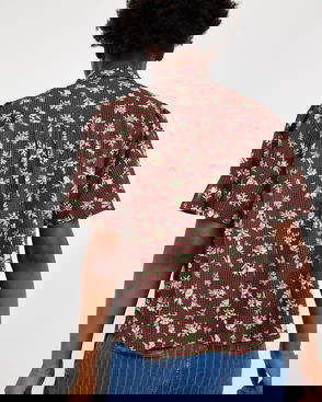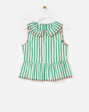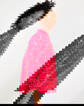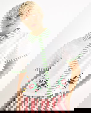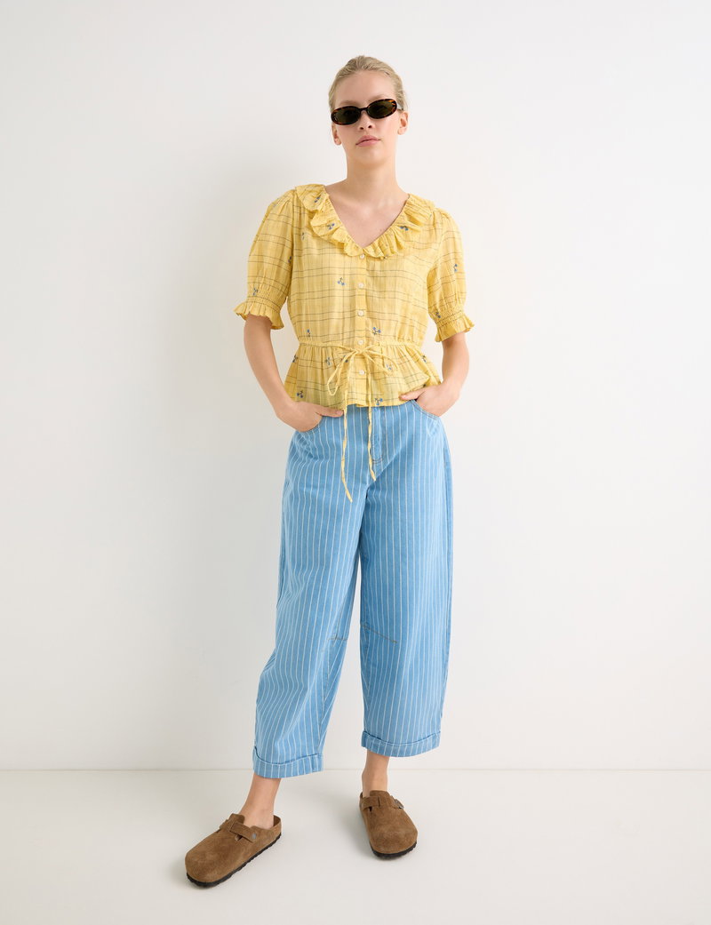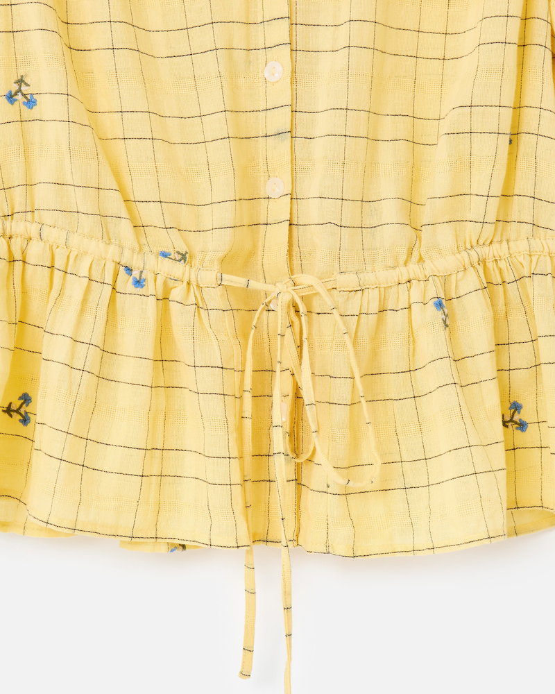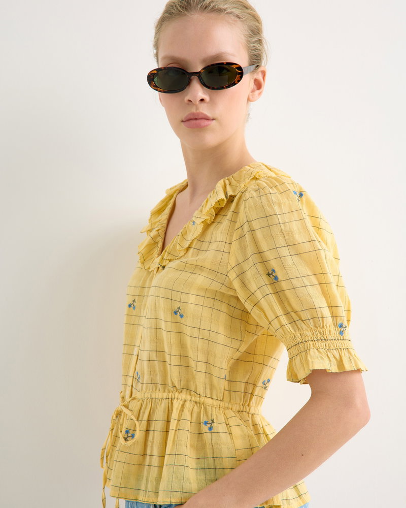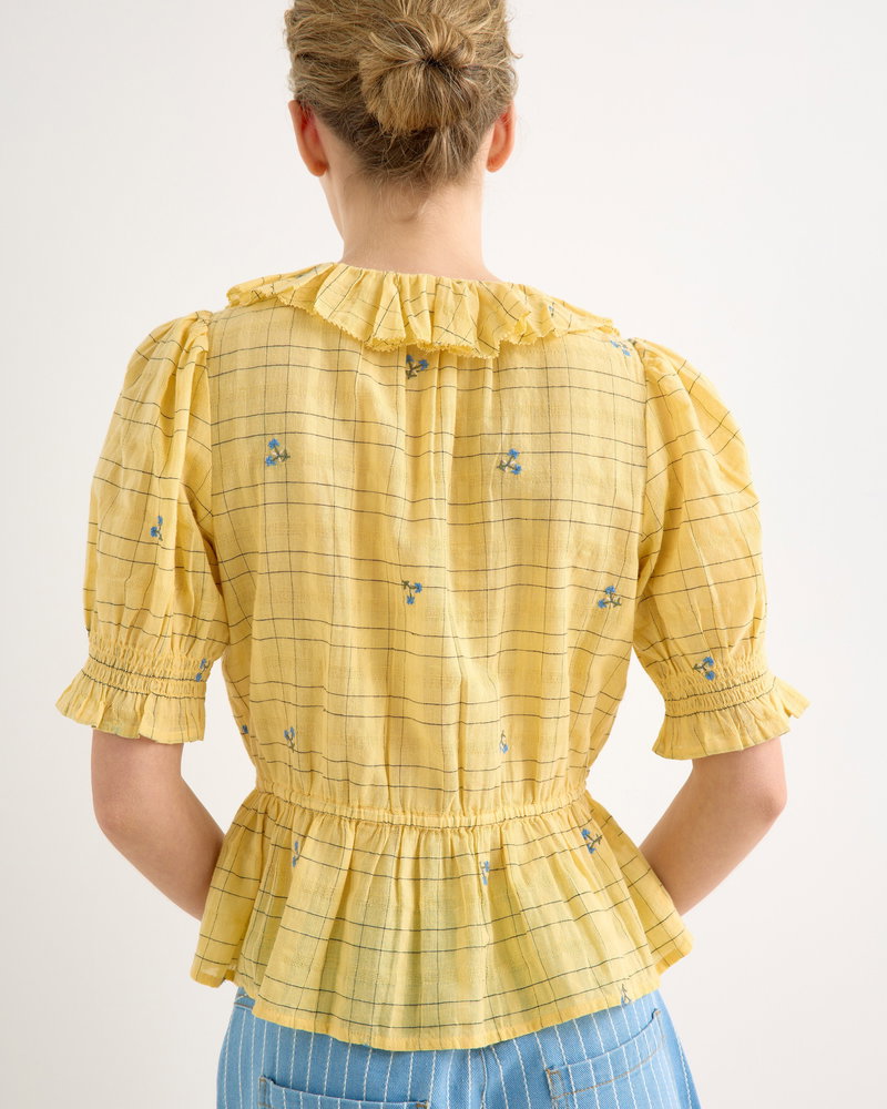 They've designed the sunshine yellow blouse with a black checked pattern accented with blue floral embroidered details. With cream buttons down the front and short sleeves with a gathered detail, they've added a frill collar to the V-shaped neckline.