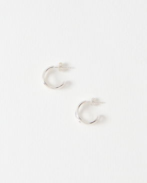 Small chunky hoop earrings in a silver plated metal, featuring a textural cross-over etched surface pattern. Finished with a stud earring back for comfortable, everyday wear. Style with the Zia Cuff Bangle and similar silver jewellery to complete the look.