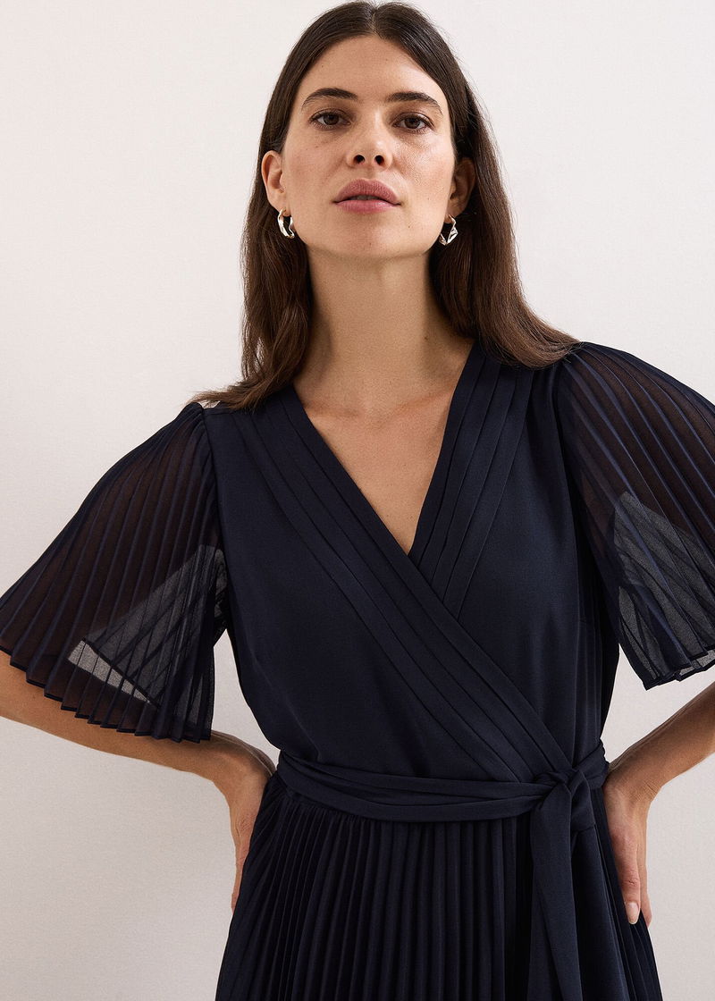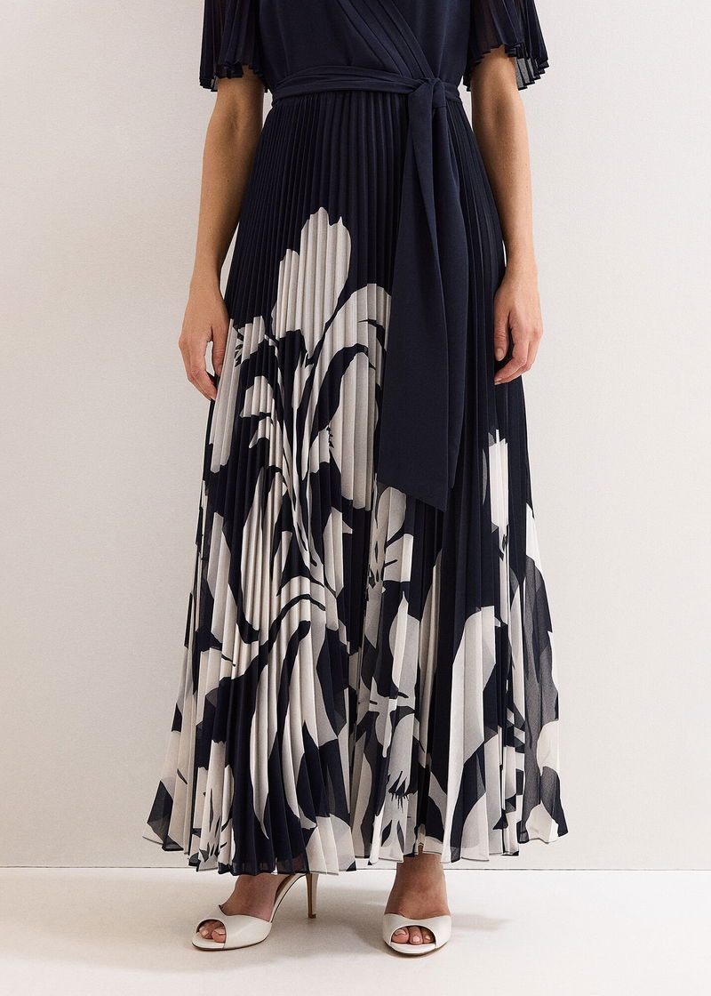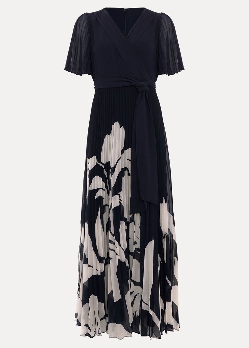 Step up your occasionwear this season with our bestselling Abigail dress. With an understated yet feminine floral print, this maxi dress features a modern V neckline and faux-wrap bodice. Delicate pleating on the sleeves and skirt add movement to the romantic silhouette. Style with matching navy accessories for a timeless event look.
