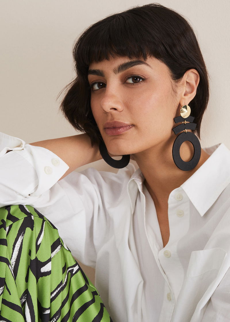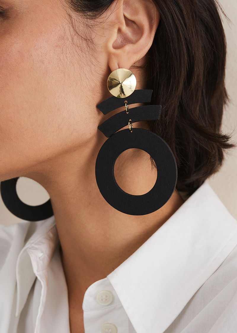 Add a statement to your everyday looks with these earrings. With black abstract shapes in a tiered structure, these earrings are sure to add a modern finish to any of your outfits.