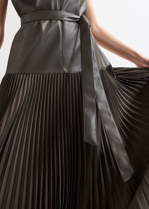 Elegant with a contemporary edge, this faux leather midi dress features a trending drop waist skirt with considered pleat details. With a tie belt for added interest, this sleeveless dress will be your new go-to for all your events.