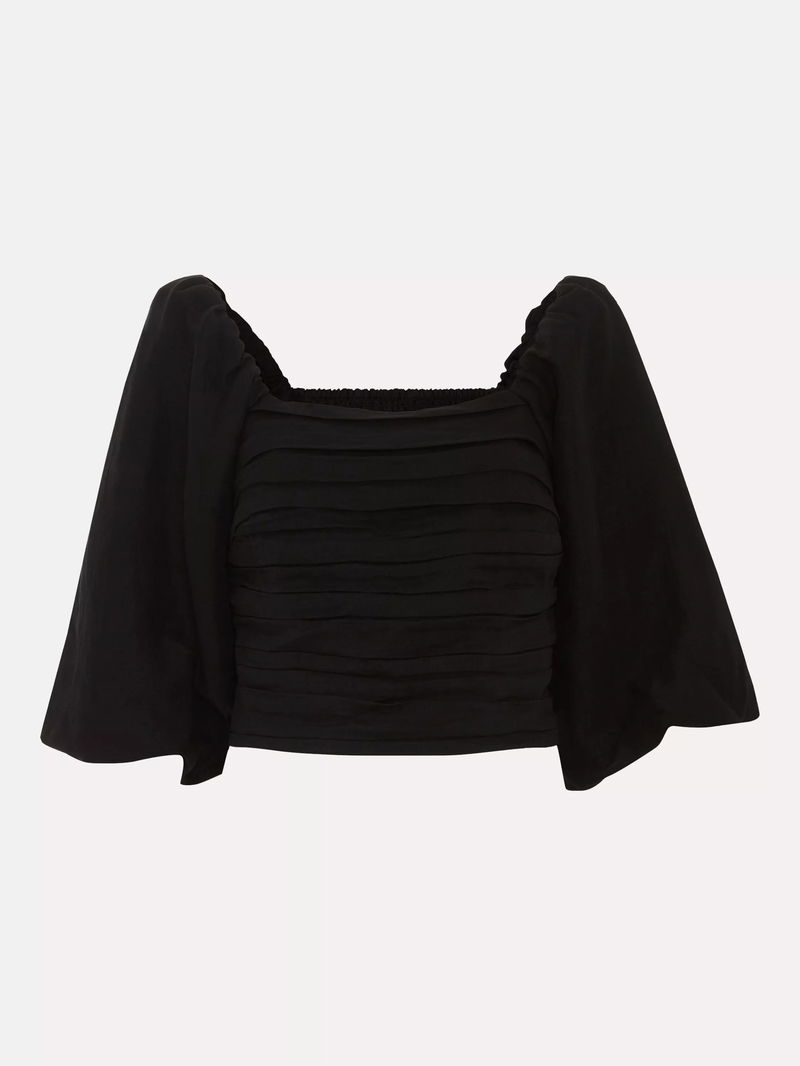 Ruching at the bodice and the shirred back ensure a flattering fit whilst exaggerated puff sleeves add volume to the silhouette. For versatile outfitting, wear as a bardot style for a contemporary look.