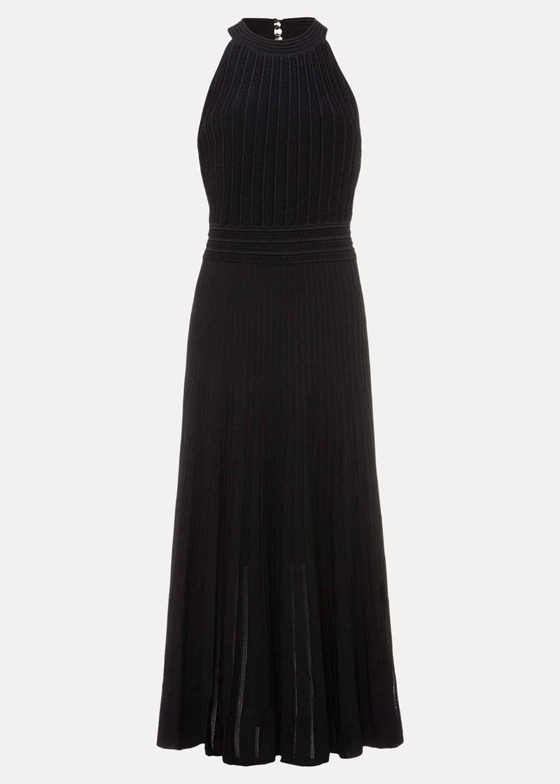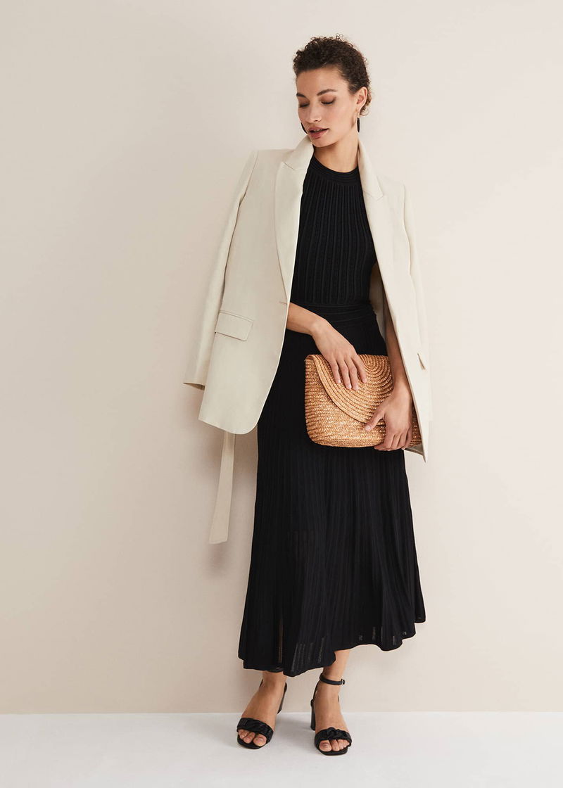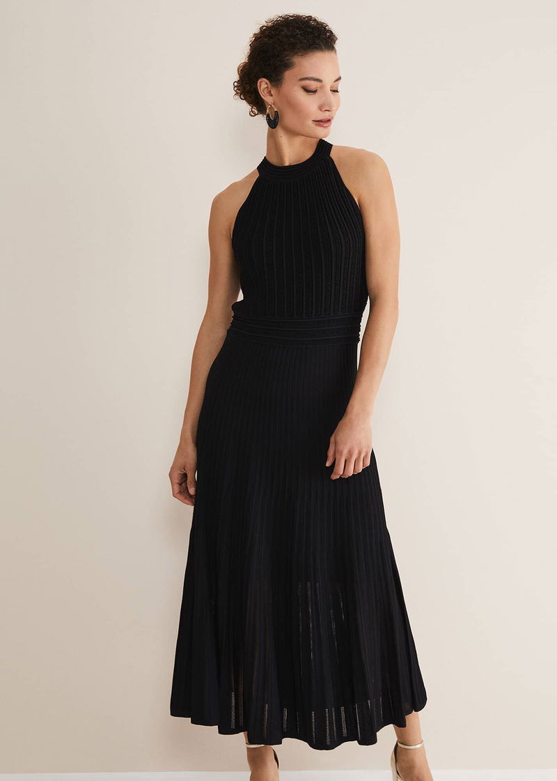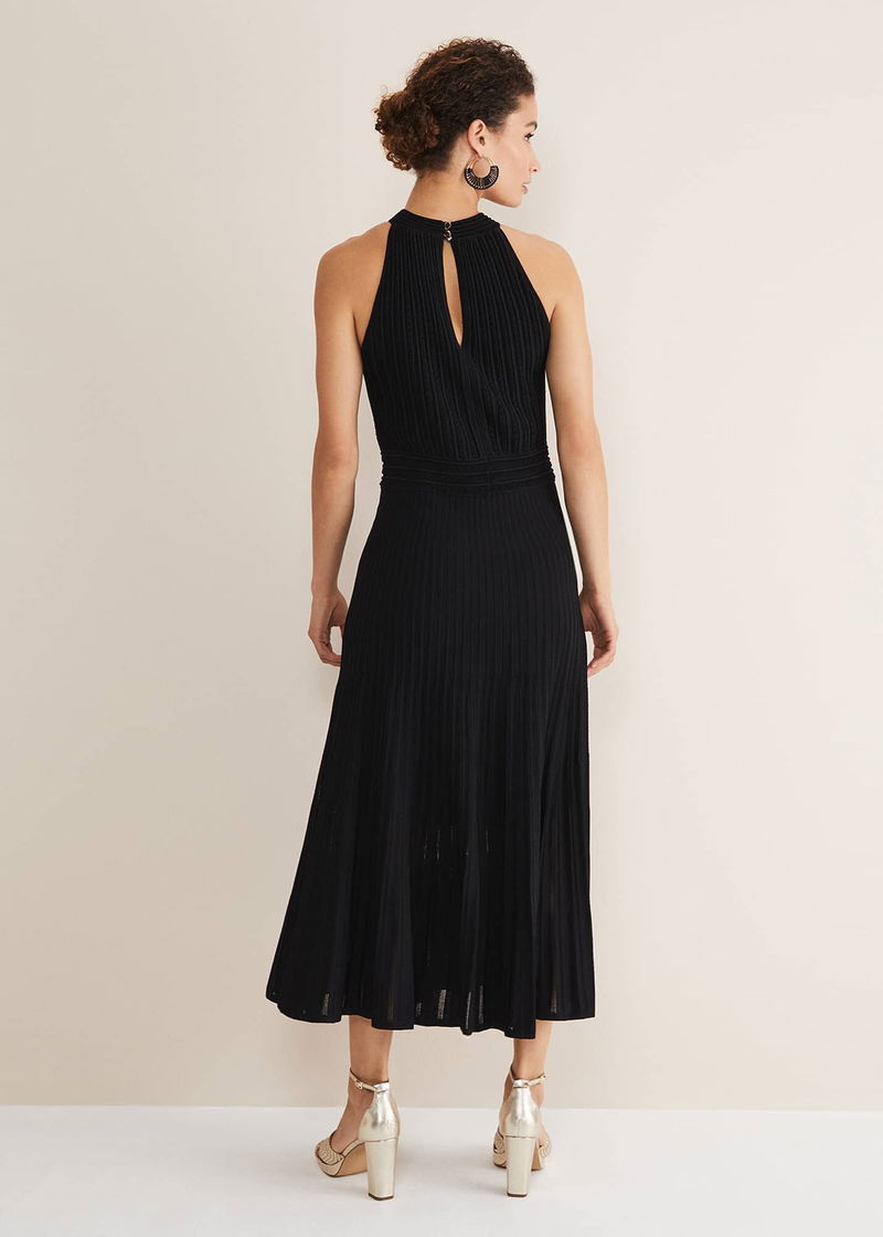 A beautiful knitted dress to wear to your next special event. Designed in a versatile black shade, the Athena dress features a ribbed texture and falls to a flowing skirt that makes beautiful movement as you walk.
