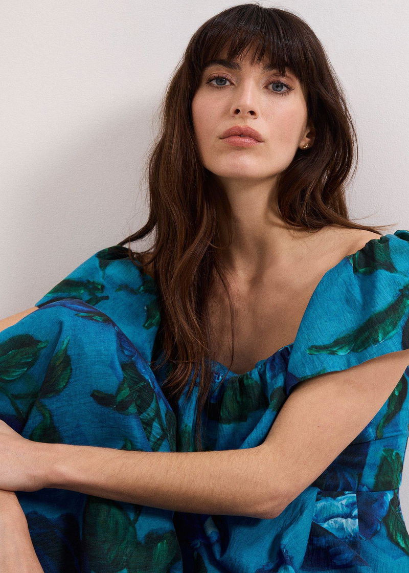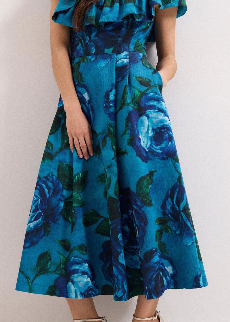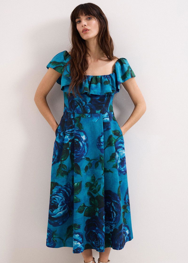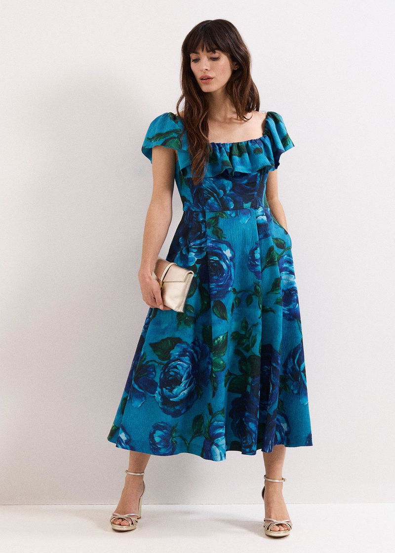With a bold floral print adorning the timeless A-line silhouette, this dress features a high impact bardot neckline with a dramatic frill, highlighting your decolletage beautifully. Wear with neutral accessories to let the dress do all the talking.