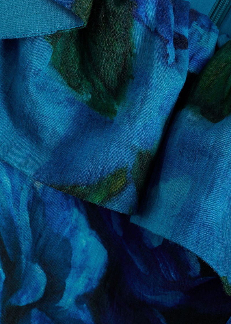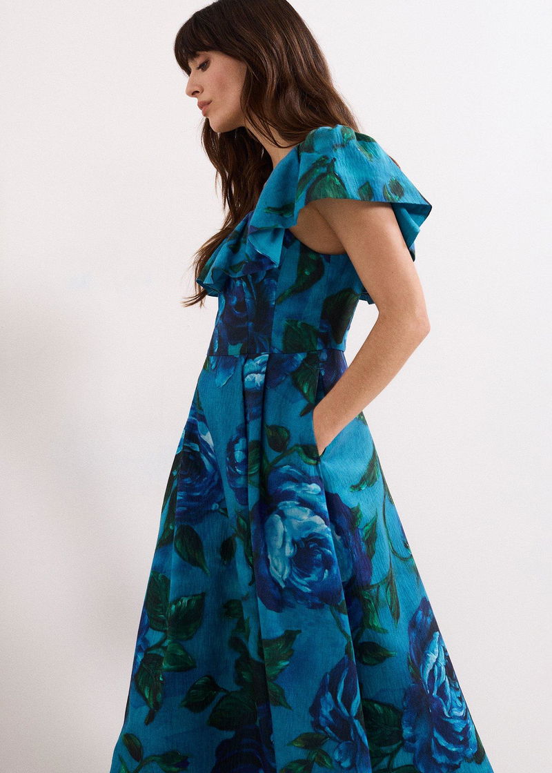 A dress guaranteed to make a statement at your next event. This midi dress is designed in a striking colour palette of deep blues and rich greens.