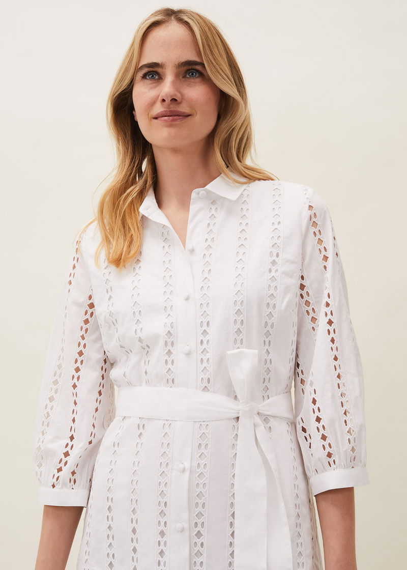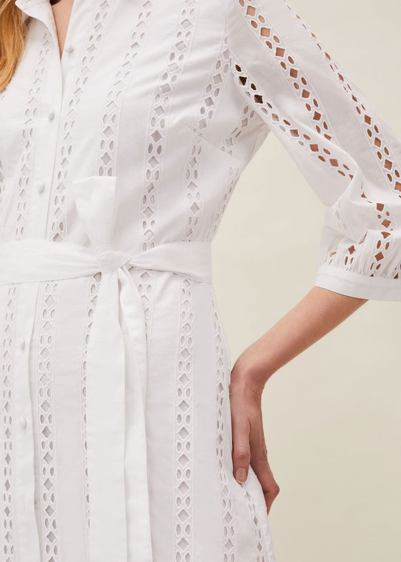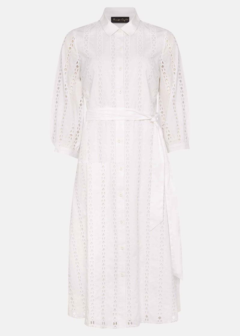 The ultimate dress for the new season. The Caela style is crafted from 100% cotton and features diamond broderie detailing throughout. Designed in a shirt silhouette, this style features a working button placket, softly blouson half sleeves and a matching waist tie. It's one we'll be wearing on repeat in the sunshine with raffia accessories.