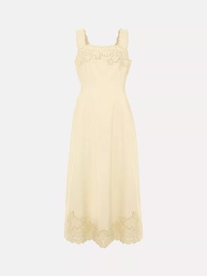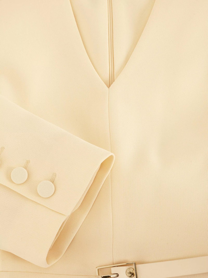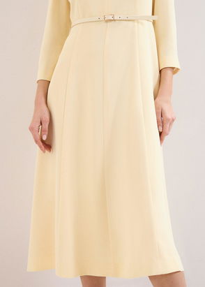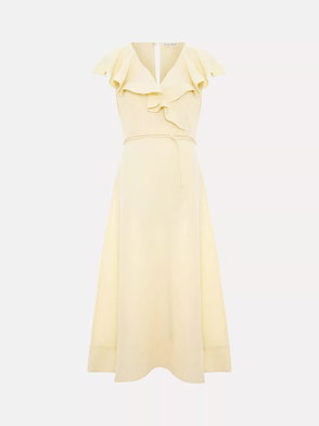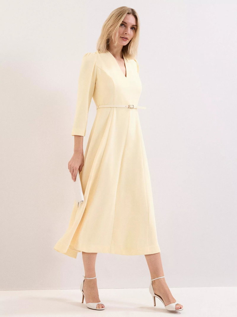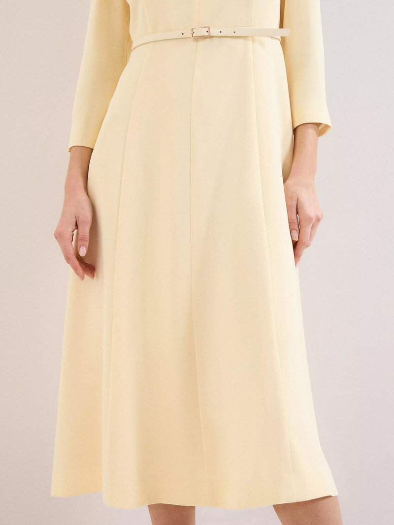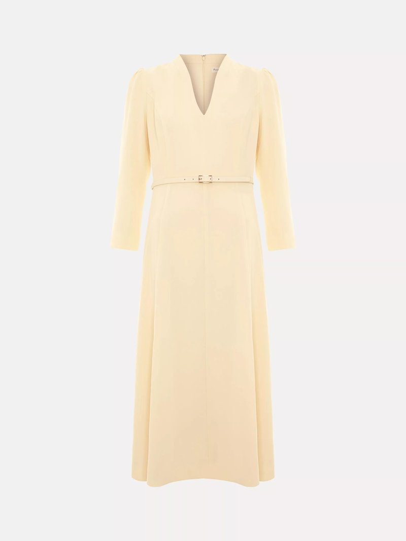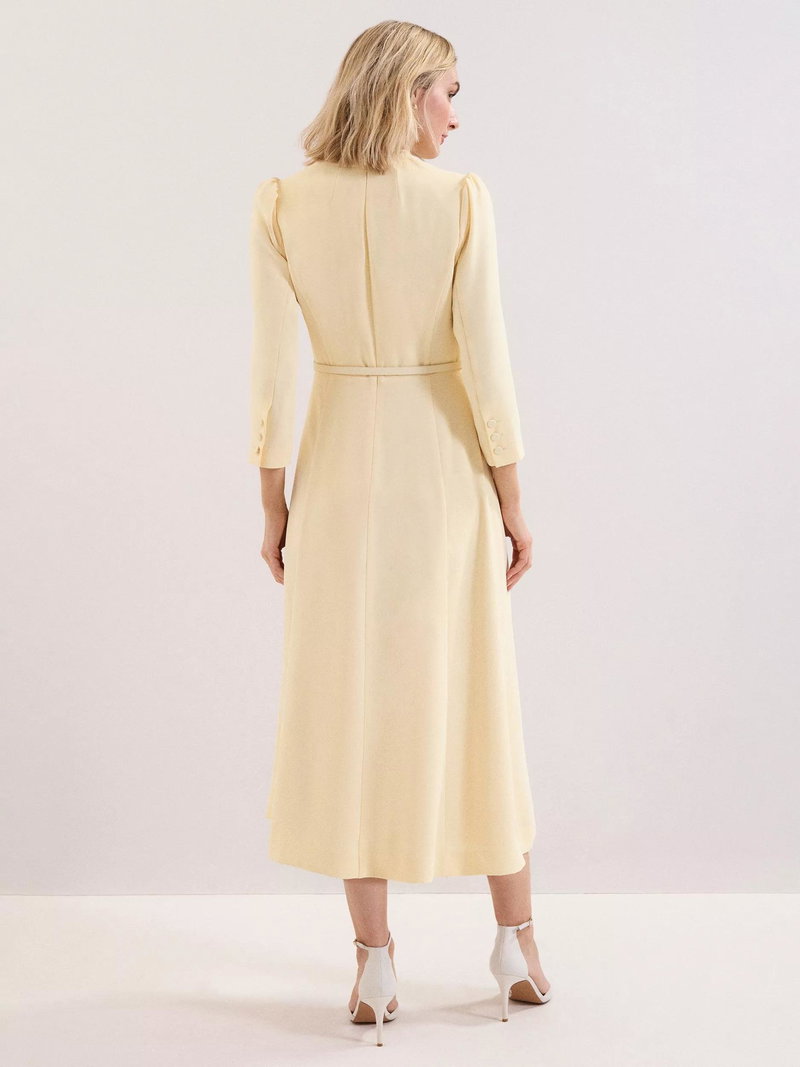 Lean into spring with this elegant, pale-yellow midi dress. Designed in a luxurious tailored silhouette, this event dress features a gorgeous V-neckline, sophisticated covered buttons to the cuffs and belt to enhance the shape.