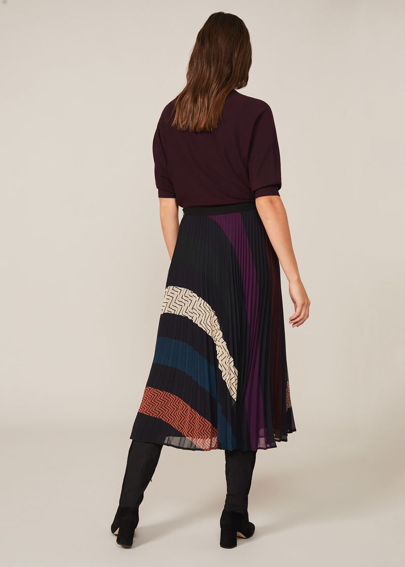 Cut to a midi length, our Emilia Skirt is designed with an eye-catching mixed geometric print that styles back perfectly with our Cristine Knit Top and knee high suede boots.