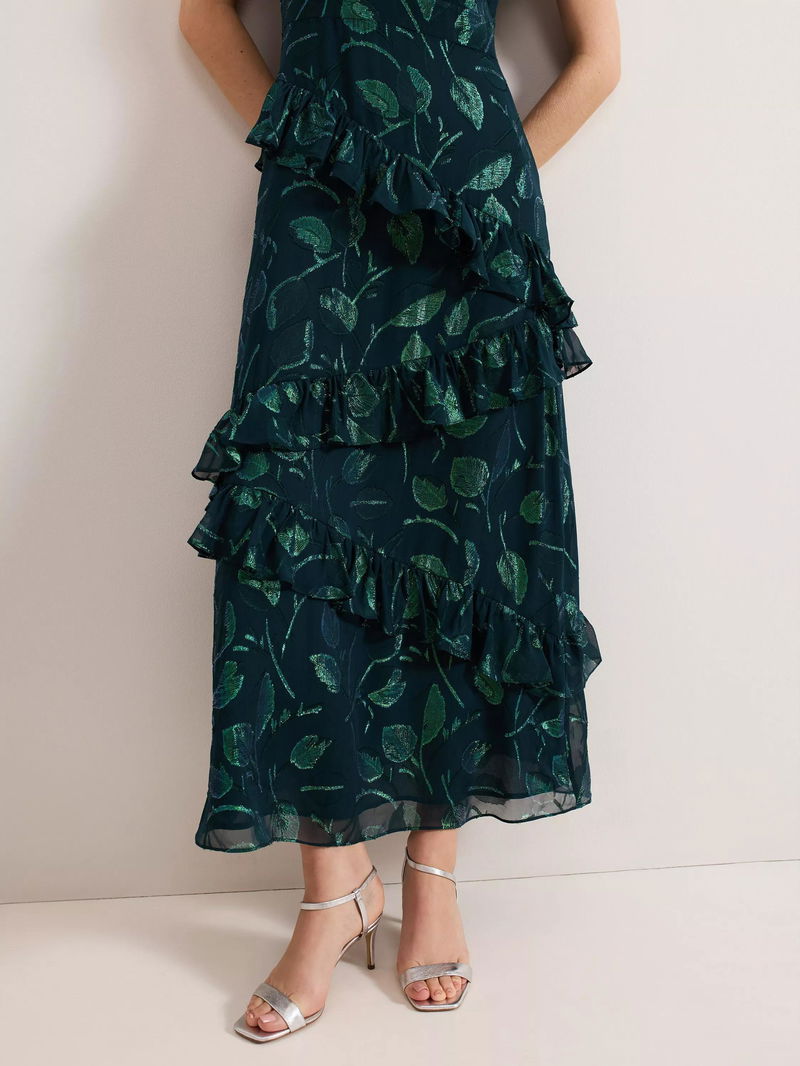 Elegant and sophisticated, the Haisley dress is a standout event style. The shade is decorated with a shimmering leaf print that catches the light as you move whilst semi-sheer bell sleeves add feminine allure. Finished with asymmetric ruffle detailing down the maxi skirt, this style will become a favourite in your occasion wardrobe.