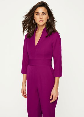 Add a pop of colour to your event wardrobe with the Helene jumpsuit. With subtly ruched shoulders that create a feminine puff sleeve effect our vibrant purple jumpsuit is sure to turn heads at every special occasion. The faux wrap style flares through to a wide leg silhouette for effortless movement, finished with a contemporary gold belt for added interest. Simply style with matching gold accessories for a coordinated look.