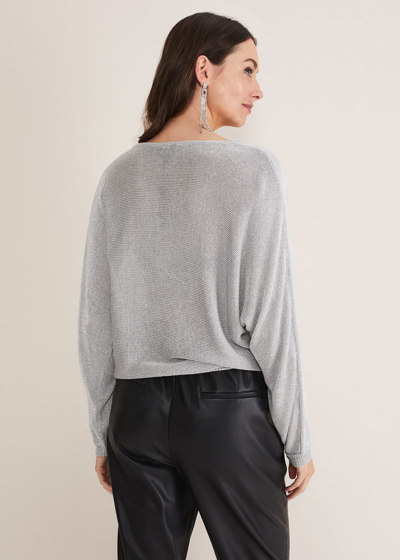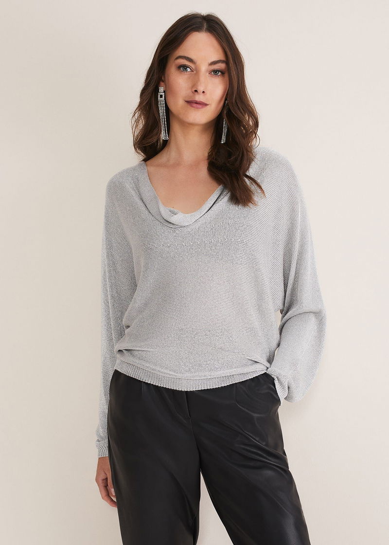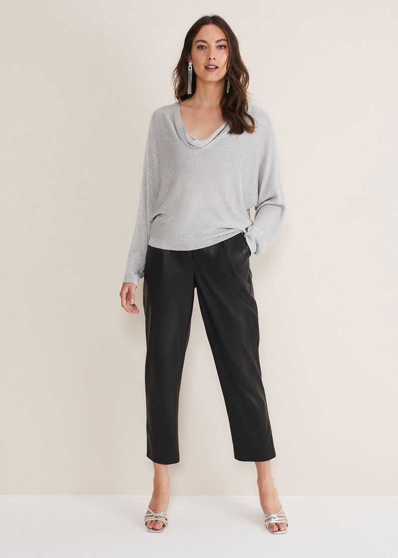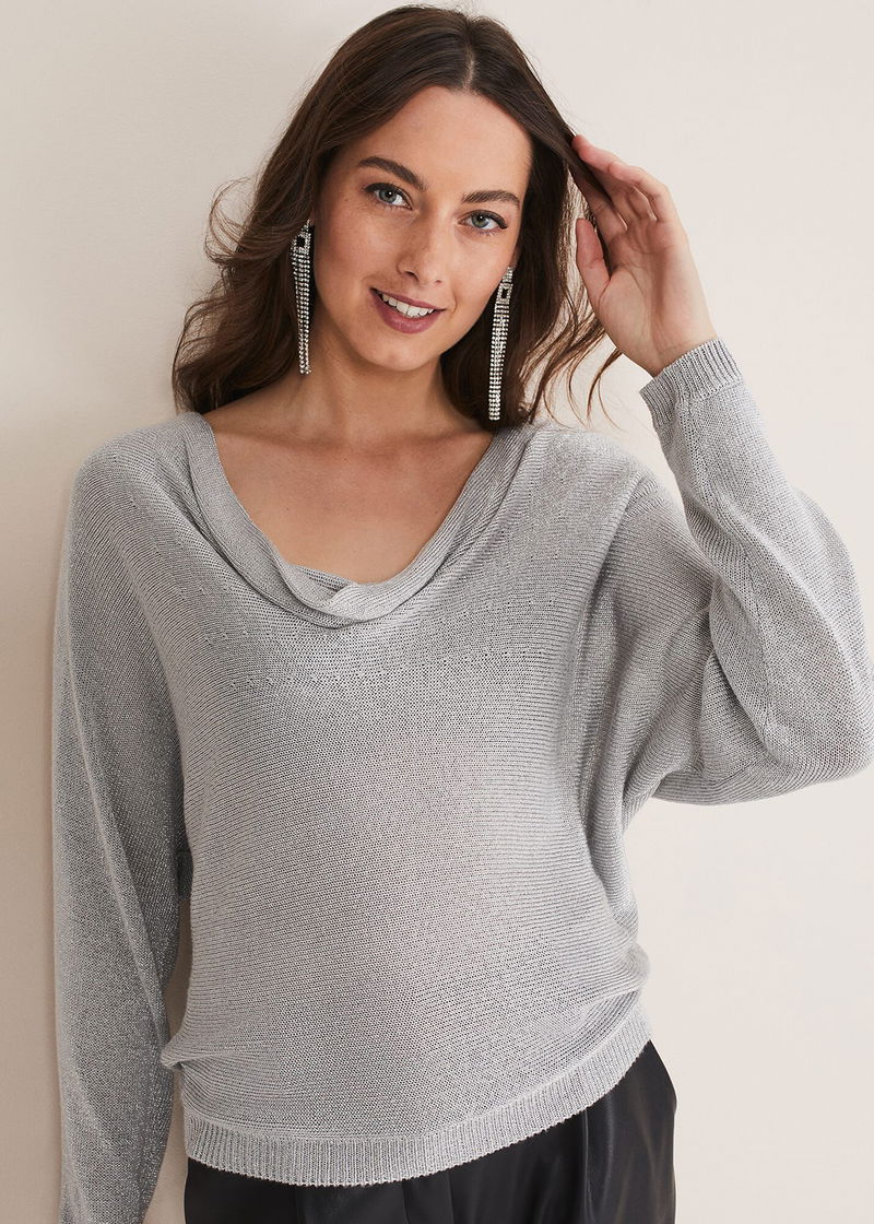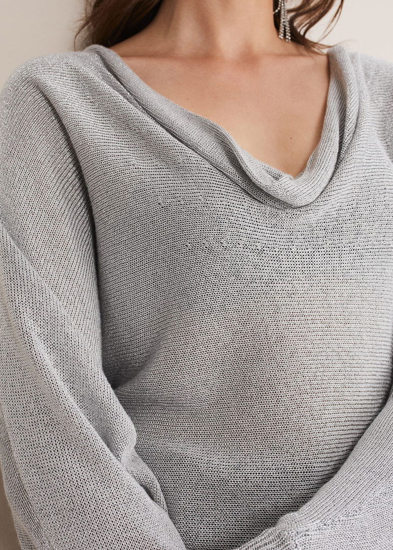 A statement jumper to add to your knitwear collection. Designed in a shimmering silver shade, our Malti knit features a feminine cowl neck and a slim fit silhouette. We wear ours over leather-look trousers and matching silver heels and earrings.